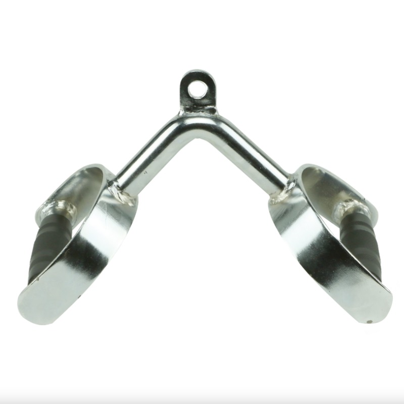 Agarradera para remo en forma de V fabricada en acero cromado con mangos engomados ergonómicos que harán tu ejercicio más cómodo y confortable.