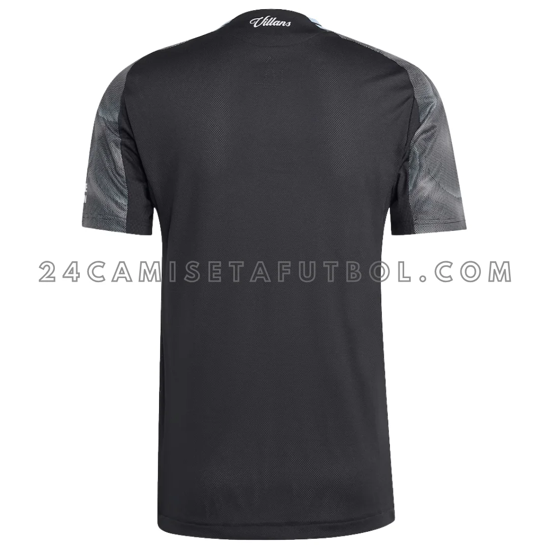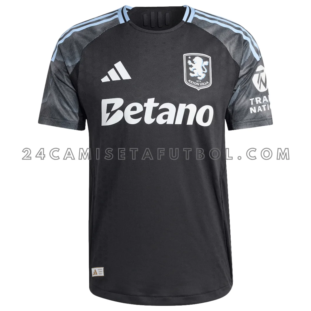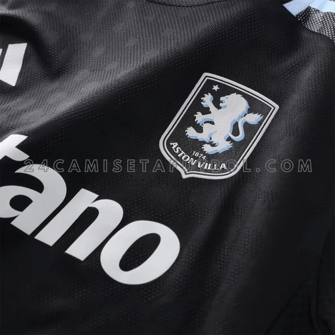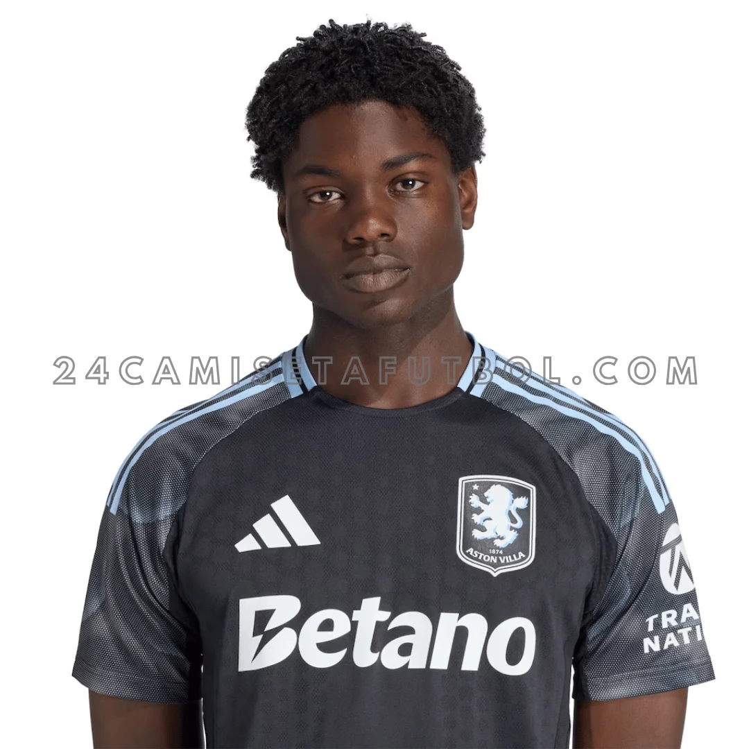 La paleta de colores de esta Aston Villa camiseta segunda incluye negro, azul cielo y carbón. La base de la camisa es negra lisa con acentos blancos. Los logotipos del club y del patrocinador están colocados en blanco en el pecho. El escudo del club también está finamente colocado en blanco en el pecho izquierdo. Las mangas de la camiseta dan un aspecto de desvanecimiento en carbón. Los hombros de la camiseta presentan rayas tradicionales en azul cielo. El cuello redondo es negro con un detalle de rayas azul cielo similar en la parte trasera. Para quienes buscan otras equipaciones de la temporada, se puede complementar con la tercera camiseta aston villa 2025/26. En general, la camiseta parece muy moderna y decente.