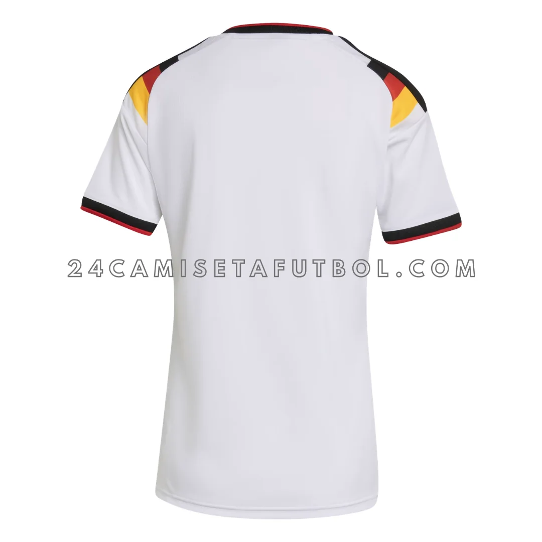 El cuello en V con mangas cortas ofrece un ajuste favorecedor para todo tipo de cuerpo. Los detalles en rojo, negro y dorado muestran los colores nacionales de Alemania, reforzando la identidad del equipo.