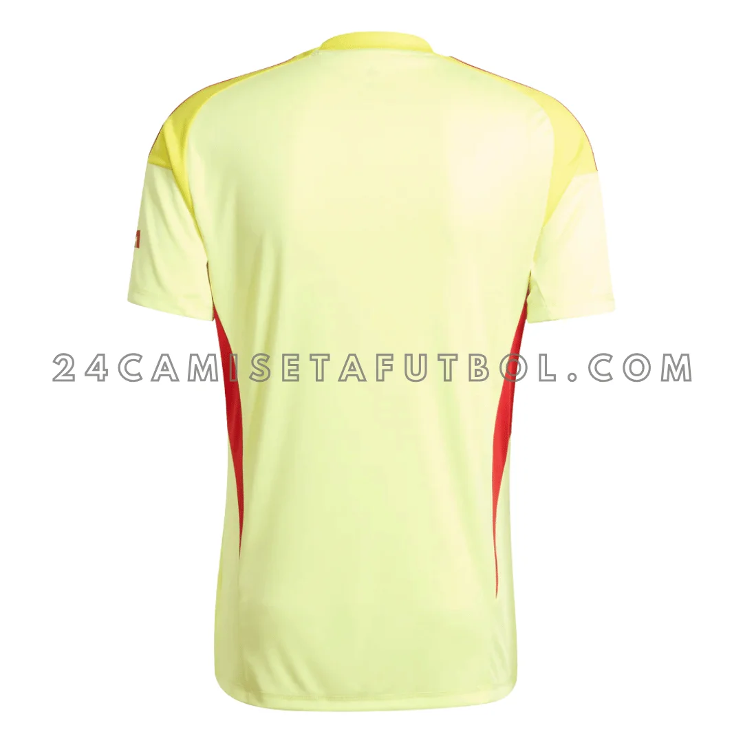 La paleta de colores de esta camiseta incluye amarillo y rojo. El color primario es amarillo limón que transiciona hacia un amarillo brillante en la parte frontal, creando un efecto degradado sutil. Los hombros presentan tres rayas tradicionales rojas que añaden contraste, mientras que el cuello redondo en amarillo brillante aporta elegancia. Los paneles elásticos y aberturas laterales en rojo permiten libertad de movimiento. Para completar tu colección de las equipaciones del Arsenal, también puedes revisar la segunda equipación del arsenal.