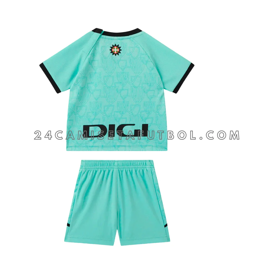 El color verde brillante hace que la camiseta Athletic Bilbao niño tercera destaque frente a las equipaciones clásicas, mientras que los detalles en negro en cuello y mangas aportan contraste. El escudo oficial del club está colocado con orgullo en el pecho, y el logo de Castore garantiza que es una equipación oficial. Además, Kutxabank aparece como patrocinador central, dándole un toque profesional y moderno.
