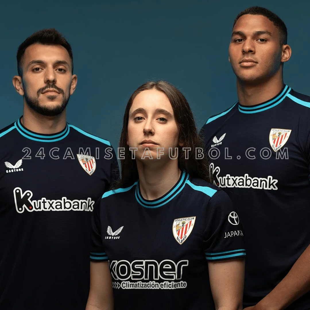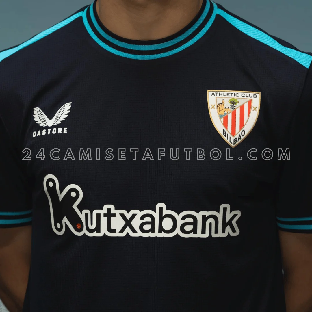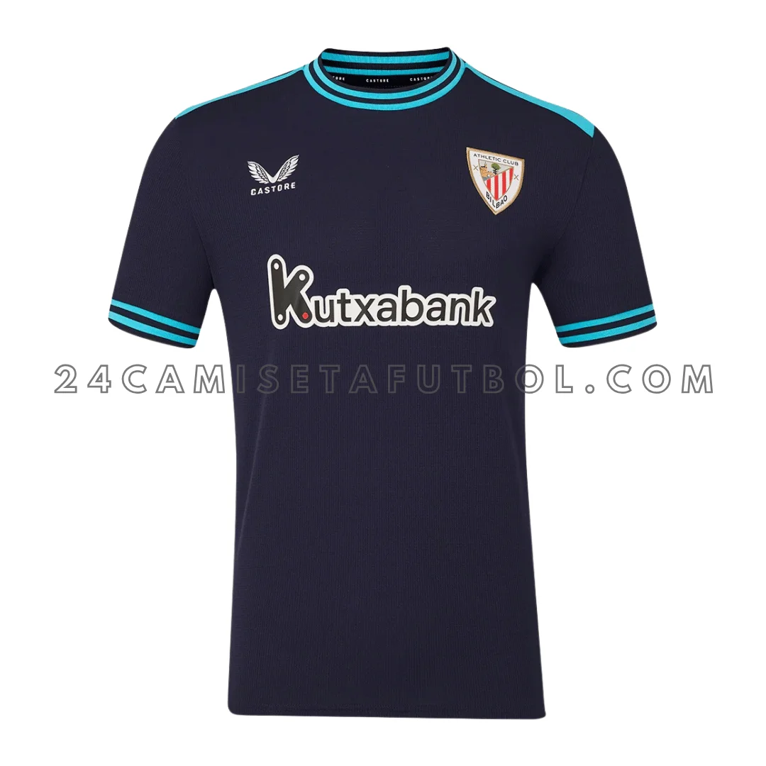 Compra la camiseta visitante del Athletic Bilbao 2025-26. Segunda equipación en azul oscuro con detalles turquesa, transpirable, cómoda y perfecta para auténticos athleticzales.
