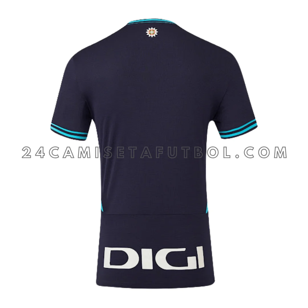 La paleta de colores incluye azul oscuro y azul claro como un turquesa. La base es lisa en azul oscuro. Los hombros tienen rayas en turquesa. Las mangas también están terminadas con dos rayas en turquesa. El cuello redondo de la camiseta también tiene un diseño de rayas similar en el mismo color. Estos pequeños acentos turquesas añaden al estilo de la camiseta sin hacer que parezca pesada. De esta manera, la camiseta permanece clásica, audaz y minimalista. Encuentra más opciones de temporada en nuestras camisetas laliga 2025/26.