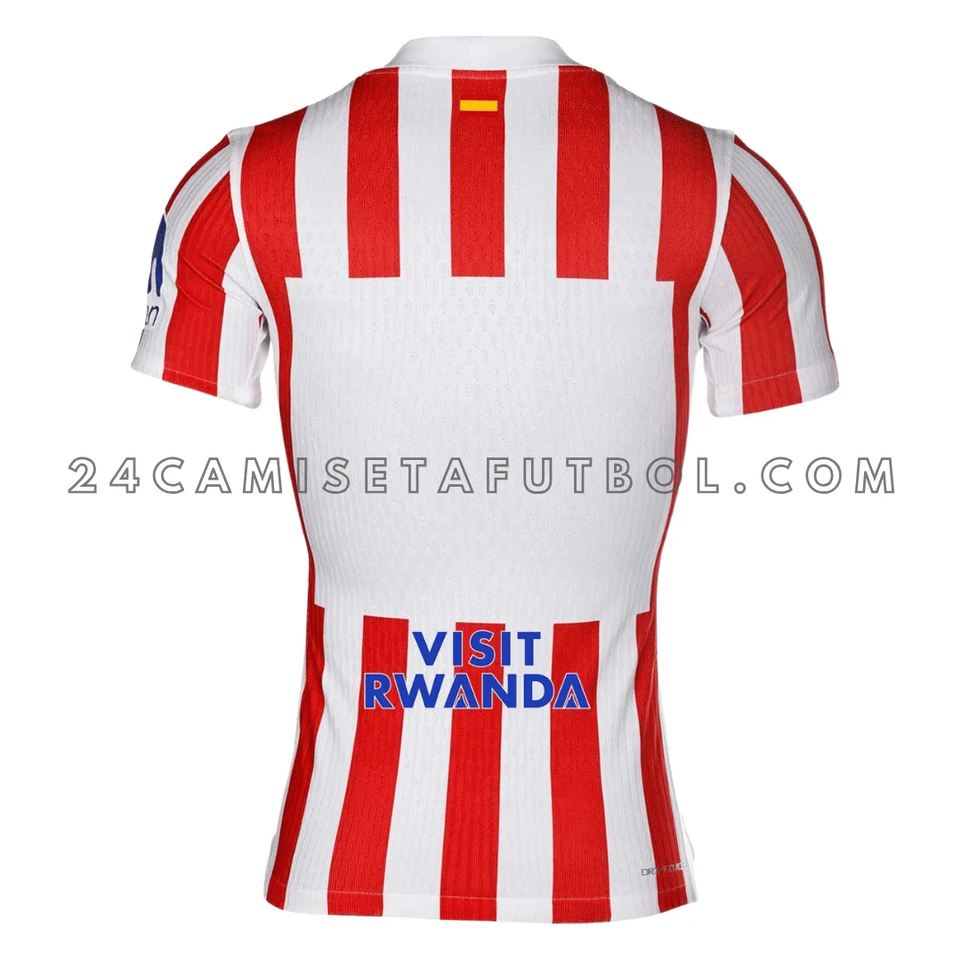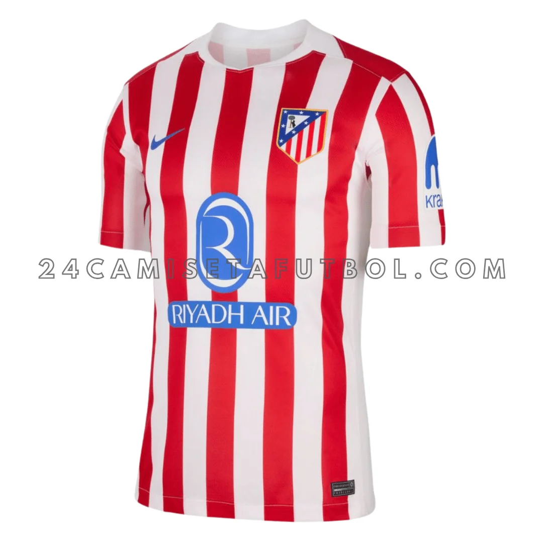 La equipación presenta los icónicos colores rojo y blanco del Atlético de Madrid junto con el azul. Las rayas son limpias y audaces. Reflejan la historia del club del «doblete» de 1995/96 y su espíritu competitivo. La paleta es nítida y fácil de reconocer en el campo. Ayuda al equipo a destacar claramente durante los partidos en casa. El diseño de la primera camiseta del Atlético de Madrid es moderno y enfocado. Las tradicionales rayas rojas y blancas, con finas líneas azules, se desvanecen suavemente entre sí. Esto le da a la camiseta un aspecto tanto clásico como dinámico. El escudo del club está finamente bordado en la parte delantera, manteniendo la identidad visual característica de las camisetas equipación laliga.