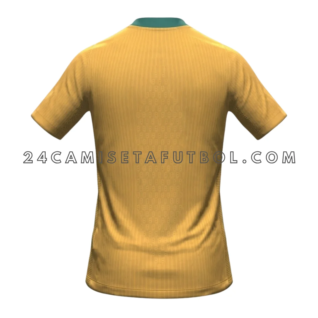 La Primera equipación selección Australia 2026 tiene una base de amarillo dorado brillante con contraste en verde. Este diseño simboliza los paisajes bañados por el sol y la energía de Australia.