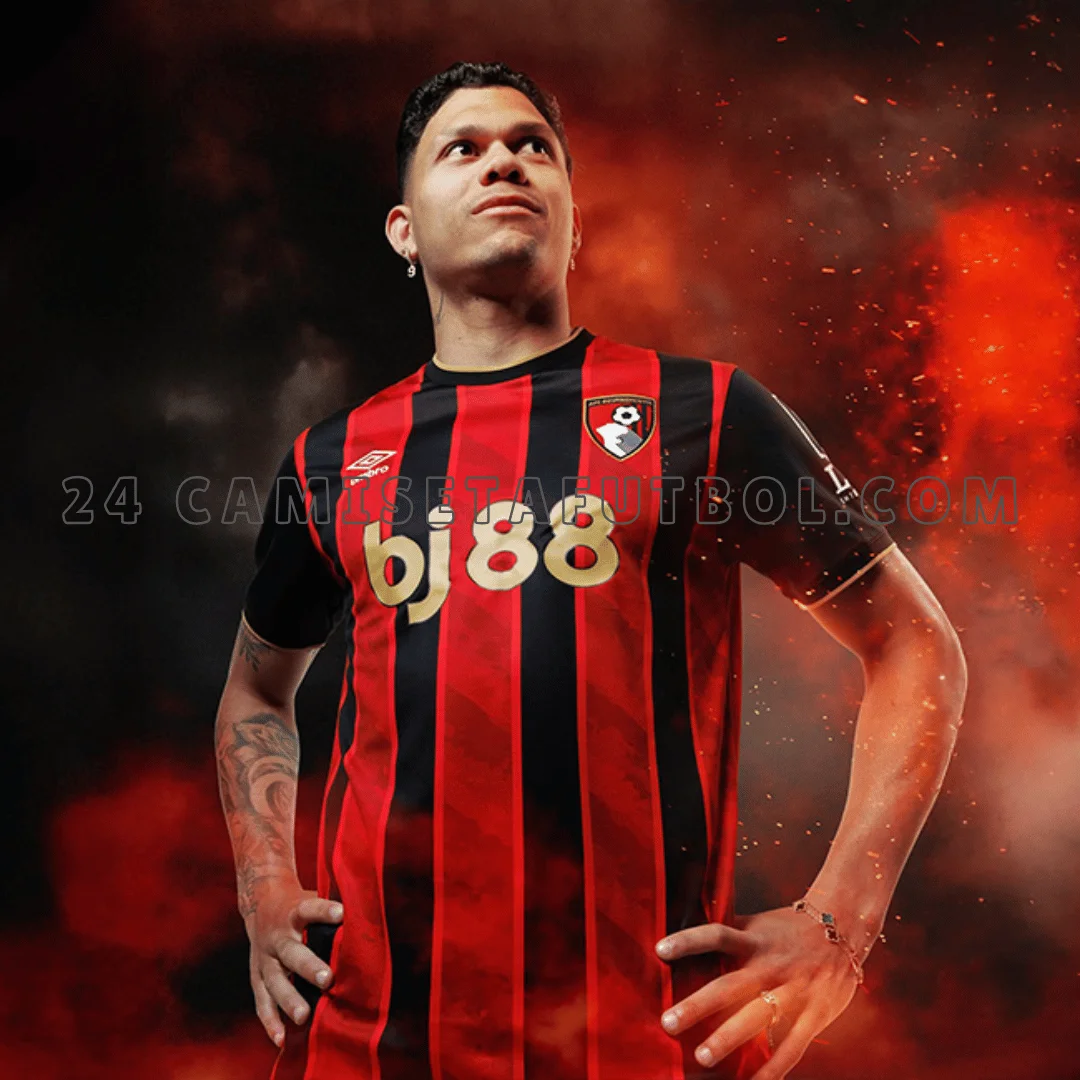 A los aficionados les encanta la Camiseta Bournemouth Primera Equipación 2025/26 porque le da un giro nuevo a su look clásico. Tiene detalles en dorado en las mangas y el cuello, lo que le da un toque especial y brillante. “bj88” es el patrocinador principal de esta camiseta bournemouth primera equipación. Los otros patrocinadores son Umbro en blanco en el lado izquierdo, y en la parte trasera del cuello se lee “AFCB” en dorado. Para completar tu colección, también puedes considerar la camiseta bournemouth segunda 2025/26 o la camiseta bournemouth tercera equipación de esta temporada.