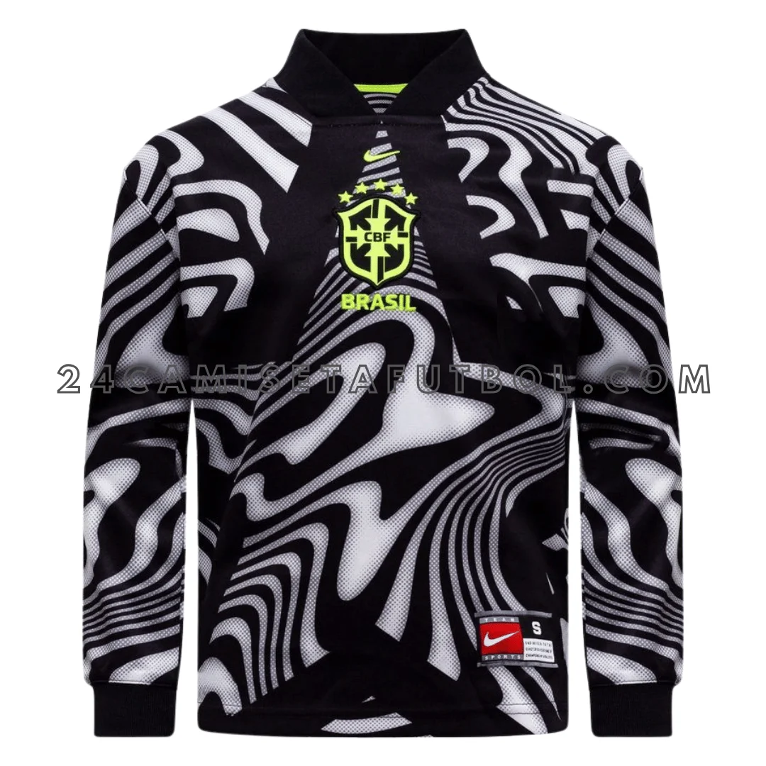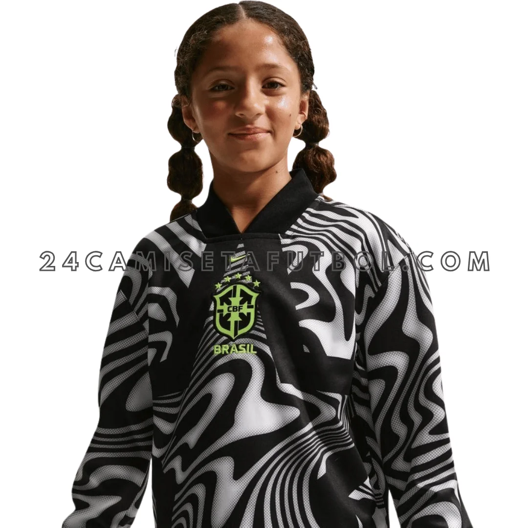 Esta genial camiseta Brasil niño portero 2026 tiene un audaz patrón cebra/espiral en blanco y negro. Es increíble y muy especial para los niños que aman el fútbol. Es perfecta para quienes siguen la camiseta fútbol Brasil. A los niños les encanta porque los hace sentirse como héroes salvando goles.