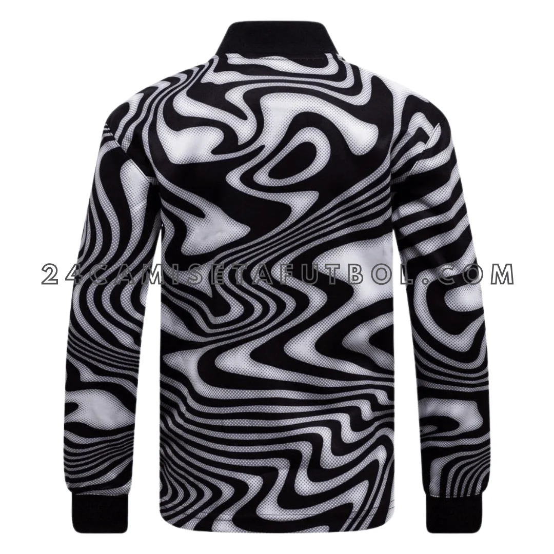La camiseta de Brasil niño portero está diseñada con geniales patrones de cebra en espiral. Esto la hace lucir salvaje y poderosa. La equipación Brasil niño portero tiene base negra con ondas blancas. También incluye el brillante escudo de Brasil en verde con cinco estrellas. Las mangas largas te ayudan a sentirte imparable en la portería.