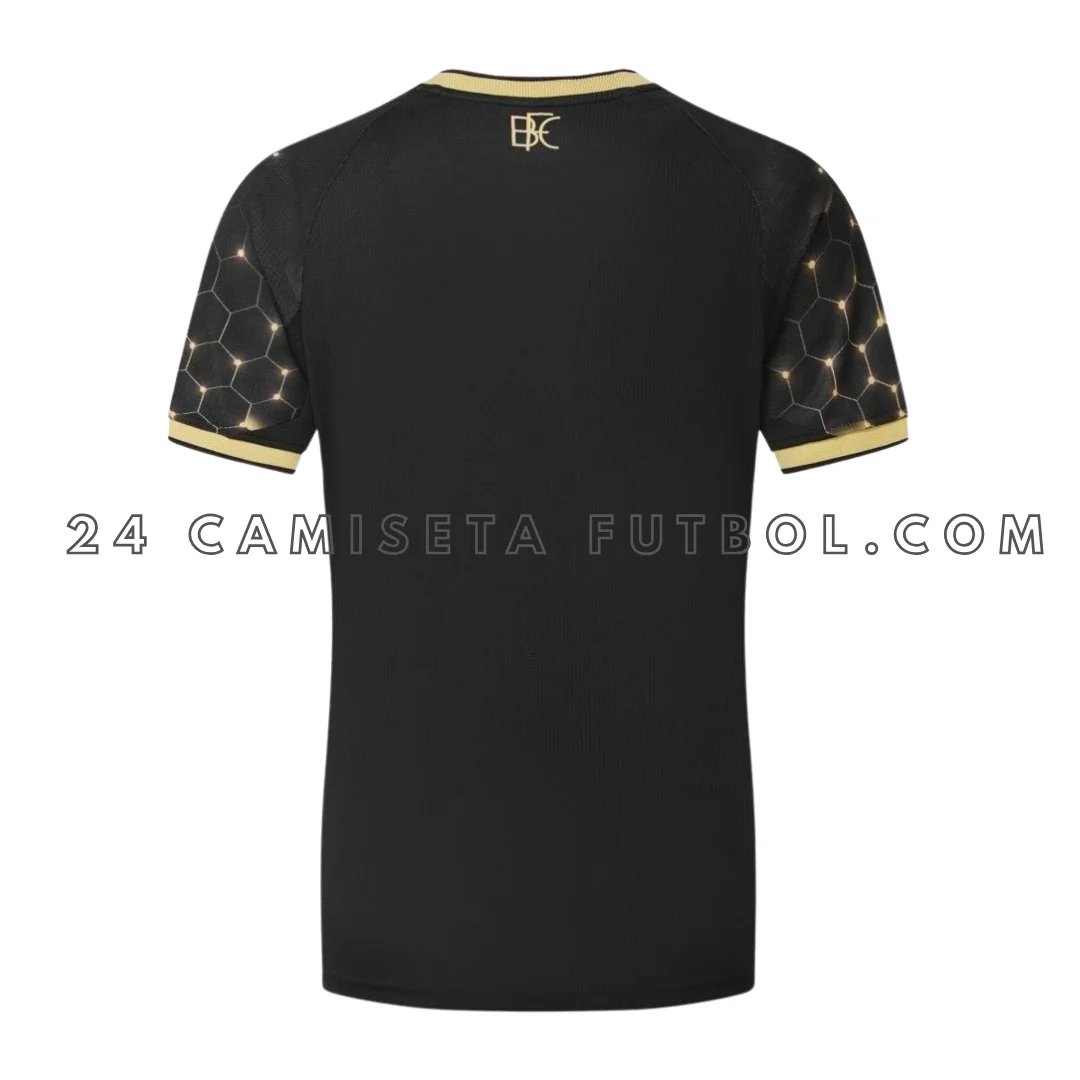 Esta es la tercera equipación, también conocida como camiseta alternativa o extra, del Burnley Football Club para la temporada 2025-2026. Los jugadores usan la camiseta burnley tercera 2025/26 en partidos promocionales y de pretemporada o amistosos. La camiseta es mayoritariamente de color negro brillante, con elegantes detalles dorados alrededor del cuello, en los extremos de las mangas y en los logotipos. La camiseta burnley tercera equipación presenta un patrón llamativo que brilla ligeramente en color dorado en las mangas y en uno de los lados. Para ver más productos del club, puedes visitar la colección de Burnley.
