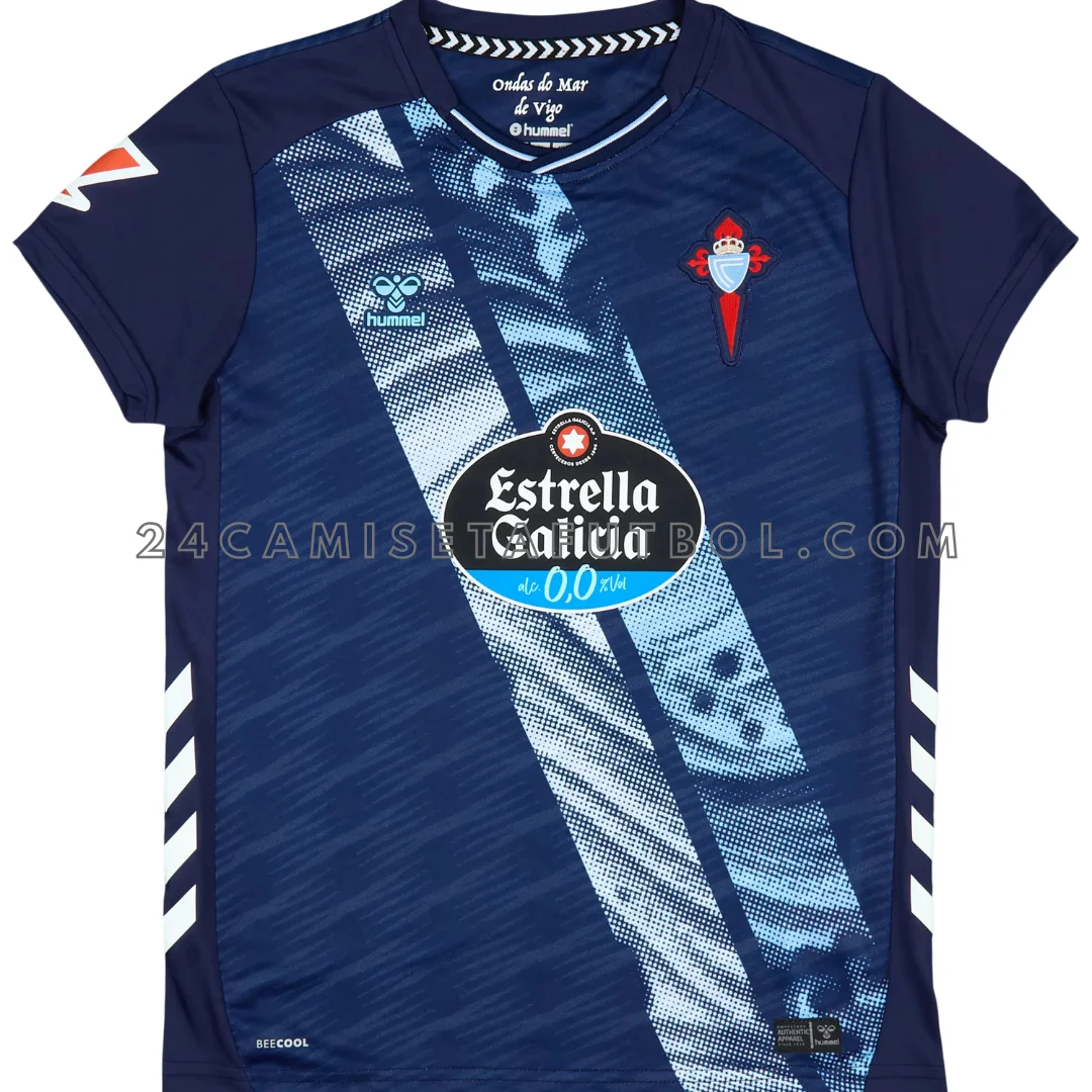 La camiseta del Celta de Vigo para niños segunda equipación tiene un color azul marino oscuro dominante. Este crea un contraste llamativo con tonos más claros. El cuello presenta un diseño único con un pequeño corte en V. También incluye ribete azul marino para un estilo deportivo. El escudo del club Celta de Vigo en el lado izquierdo simboliza tradición y orgullo. La tecnología de Hummel mantiene la camiseta infantil Celta de Vigo segunda fresca y cómoda después de un día largo.