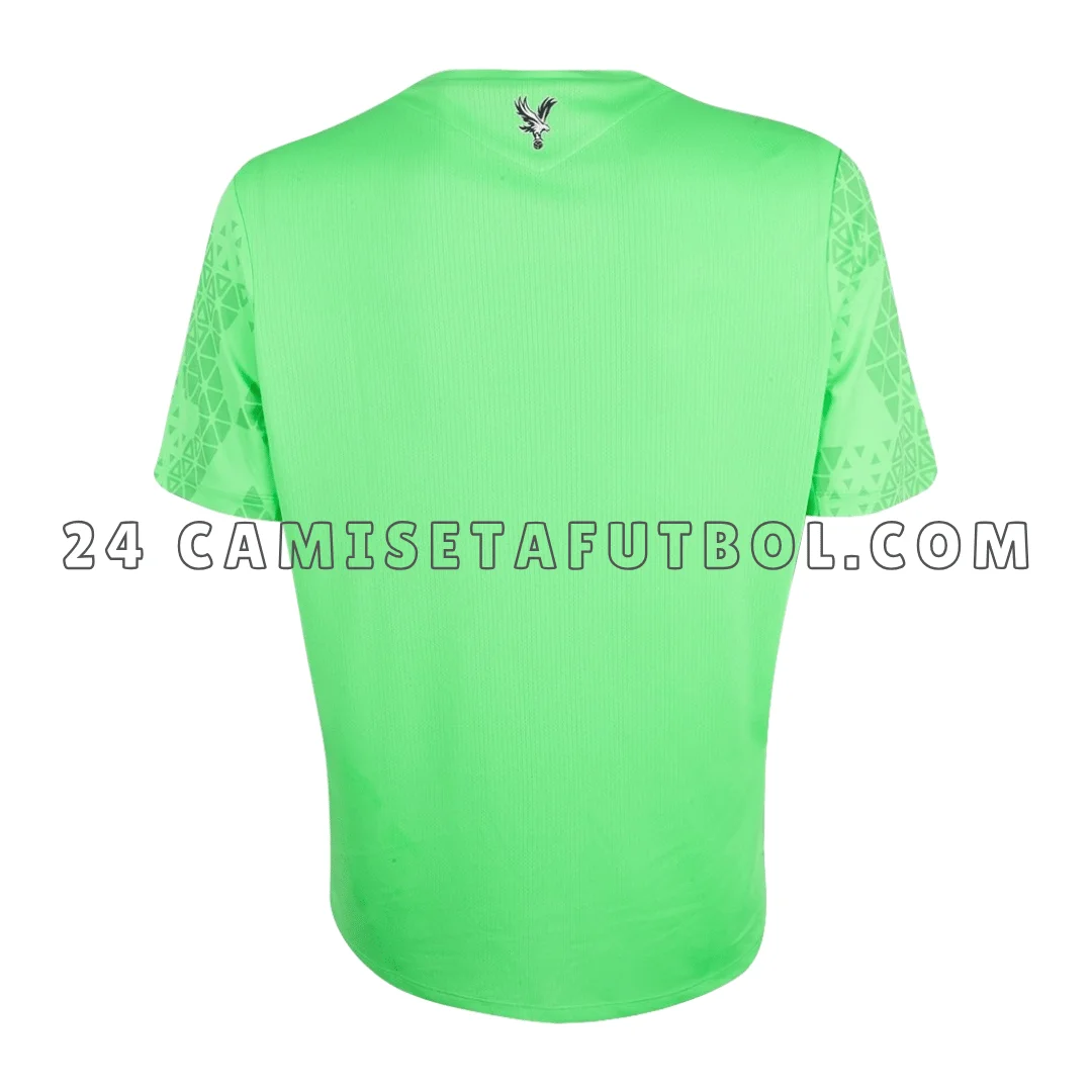 La paleta de colores de esta camiseta Crystal Palace portero 2025/26 incluye verde y negro. La base es verde con acentos negros. Es una camiseta con diseño de chevrón. Los patrones de chevrón se pueden ver por todo el frente y las mangas, dándole a la camiseta un aspecto gráfico. El cuello de la camiseta es un cuello redondo en negro. Los logotipos del patrocinador y de la marca están colocados en negro. El escudo del club también aparece en el pecho izquierdo en sus propios colores. La Crystal Palace equipacion portero también tiene un gráfico de águila en la parte posterior del cuello, similar a las camisetas de local y visitante. Para ver más productos del mismo club, puedes visitar la colección de Crystal Palace.