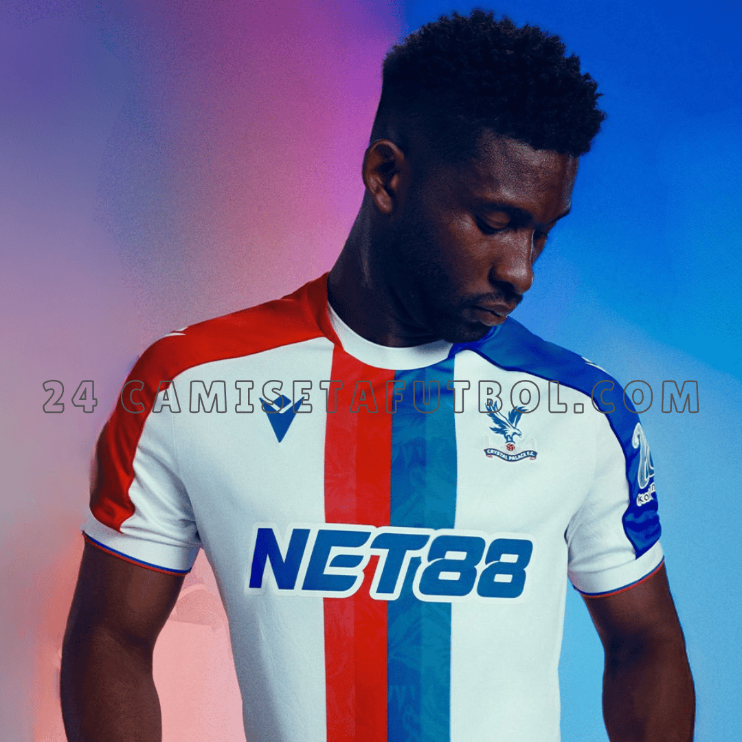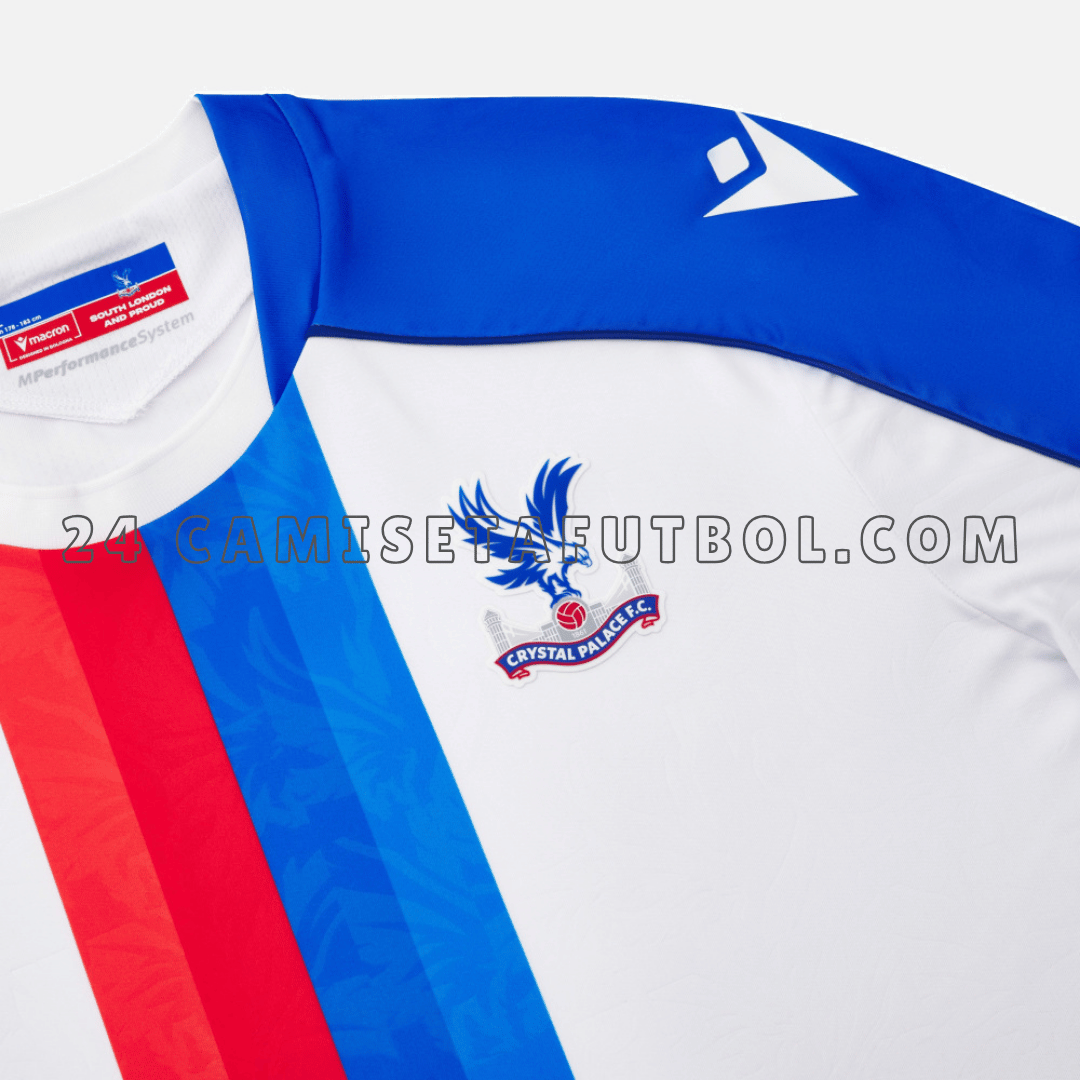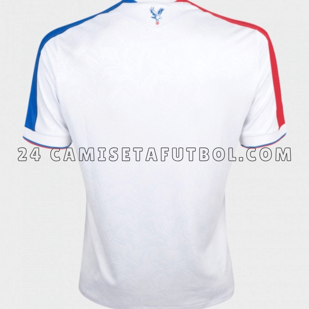 La paleta de colores de la camiseta incluye blanco, azul y rojo. Este es un nuevo estilo del diseño clásico de una sola raya del club. La base de la camiseta de la Crystal Palace equipacion segunda es blanca. Incluye rayas en tonos divididos rojo y azul en el centro. La camiseta tiene un cuello redondo con bordes asimétricos en rojo y azul. Una manga de la camiseta es en azul mientras que la otra es en rojo. Las mangas también están terminadas con puños. Los logotipos de la marca, del patrocinador y del escudo también están colocados en el pecho en azul. El escudo del águila es muy nítido y claro.