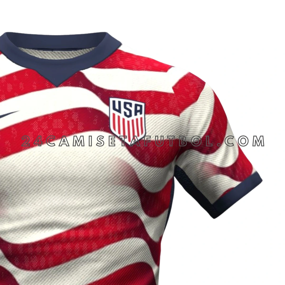Las franjas rojas horizontales recorren todo el frontal. Este detalle le da a la primera camiseta estados unidosequipación un aspecto único. El diseño está inspirado en una bandera estadounidense ondeando.
