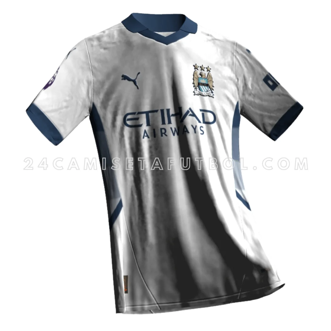 La estructura general de esta camiseta combina un estilo clásico con un look moderno. El escudo circular incluye un barco dorado, que representa la historia industrial y marítima de Manchester. La mini rosa roja dentro del escudo simboliza a Lancashire. El logotipo de Puma indica que está hecha con tela de buena calidad y suave al tacto. Etihad Airways es el principal patrocinador de esta camiseta, cuyo logotipo aparece en el frente de la camiseta local Haaland del Manchester City. Además, Etihad es también el nombre del estadio de la ciudad, el Etihad Stadium.