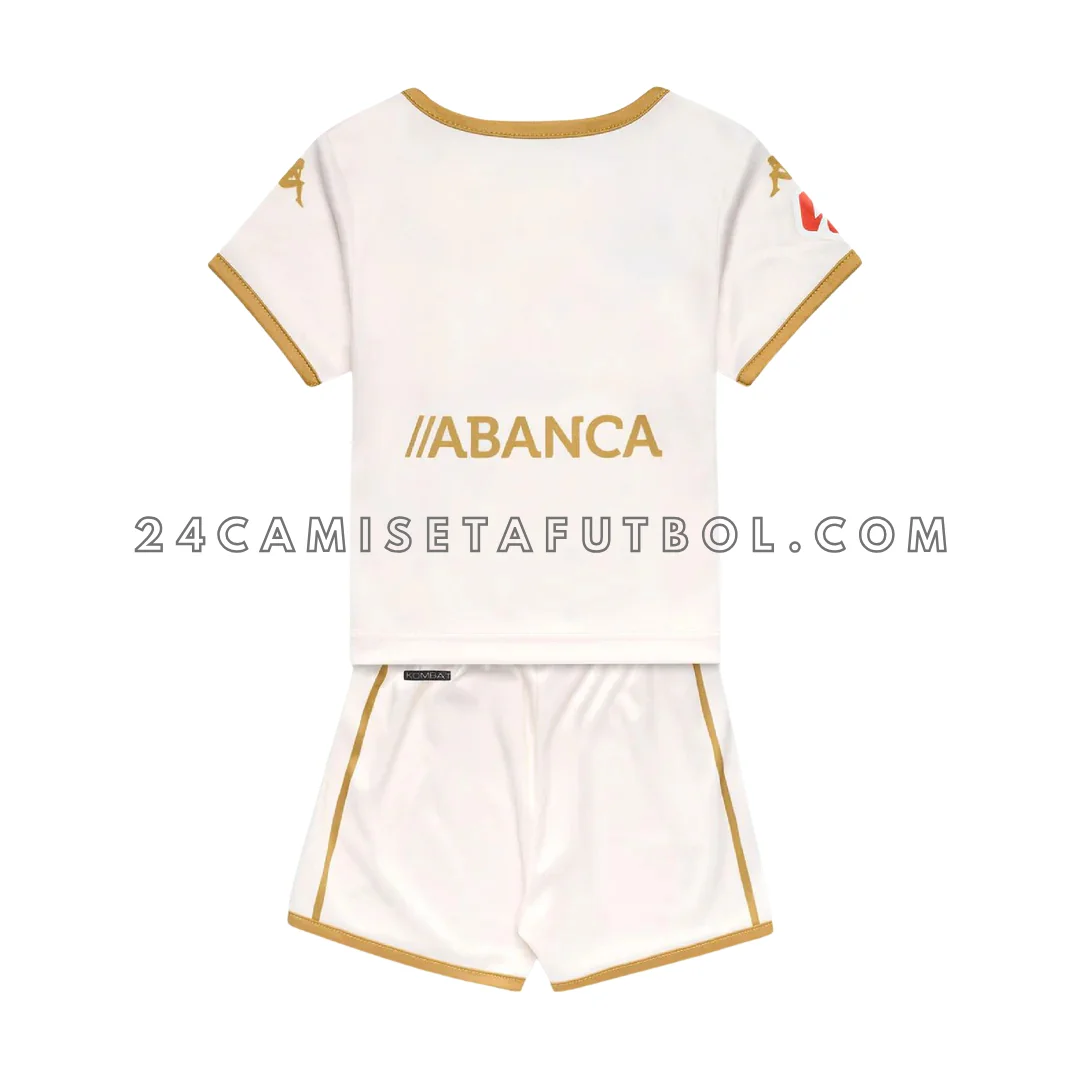 Es una combinación perfecta de comodidad y autenticidad para los días de partido. La camiseta infantil Deportivo de la Coruña tercera tiene un color base crema con un diseño frontal vertical en azul cielo. Las franjas doradas añaden un contraste impresionante. Los detalles elegantes y las líneas limpias crean un patrón dinámico. Todo esto le da a la camiseta un aspecto muy estilizado. El escudo oficial del Deportivo en el pecho simboliza lealtad e historia.