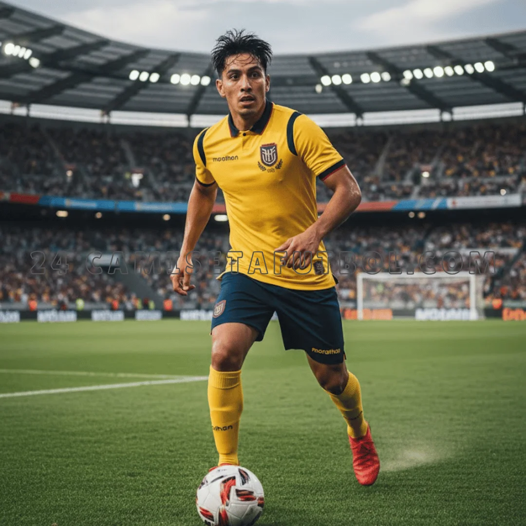 Las camisetas de futbol ecuador primera son ligeras, elásticas y tienen pequeños agujeros para que entre aire, perfectas para correr o para partidos largos. En el interior del cuello, «ECUADOR» en letras rojas, está el logo del equipo. Marathon es el patrocinador principal de esta camiseta ecuador local.Todo el tejido es suave, como tu camiseta favorita para deportes. Muchos aficionados dicen que es la camiseta de Ecuador más cómoda de todas, ideal tanto para jugar al fútbol en el parque como para usarla en la escuela.