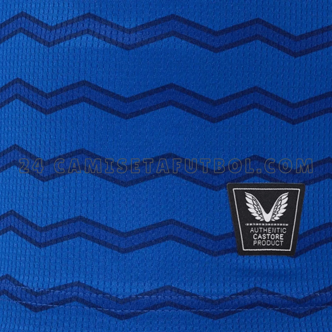 La paleta de colores de esta Everton camiseta primera incluye azul, azul marino y blanco. El color base es azul con un diseño gráfico en azul marino. Este azul real es el color primario del club desde 1901. El diseño es un patrón de ondas tonales. Consiste en líneas finas, horizontales y onduladas que recorren todo el frente. Las mangas también tienen un diseño similar. Este diseño está inspirado en las corrientes y el flujo del río Mersey. Los logotipos del club, del patrocinador y de la marca están colocados en el pecho en blanco. La equipación del Everton primera tiene un cuello en V. Está delineado con un detalle de ribete blanco. Este cuello fue usado para la camiseta local de la década de 1980. Crea una conexión con el pasado y el presente del club. Los aficionados también pueden explorar toda la colección de Everton para descubrir más camisetas del equipo. El interior del cuello también lleva un lema, «Nil Satis Nisi Optimum”.