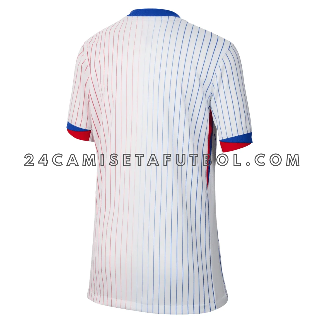 La camiseta blanca brillante de Francia tiene finas rayas azules y rojas. Es el estilo visitante que usan los grandes héroes cuando juegan fuera de casa. Al ponértela, te sientes fuerte, rápido y lleno de orgullo.