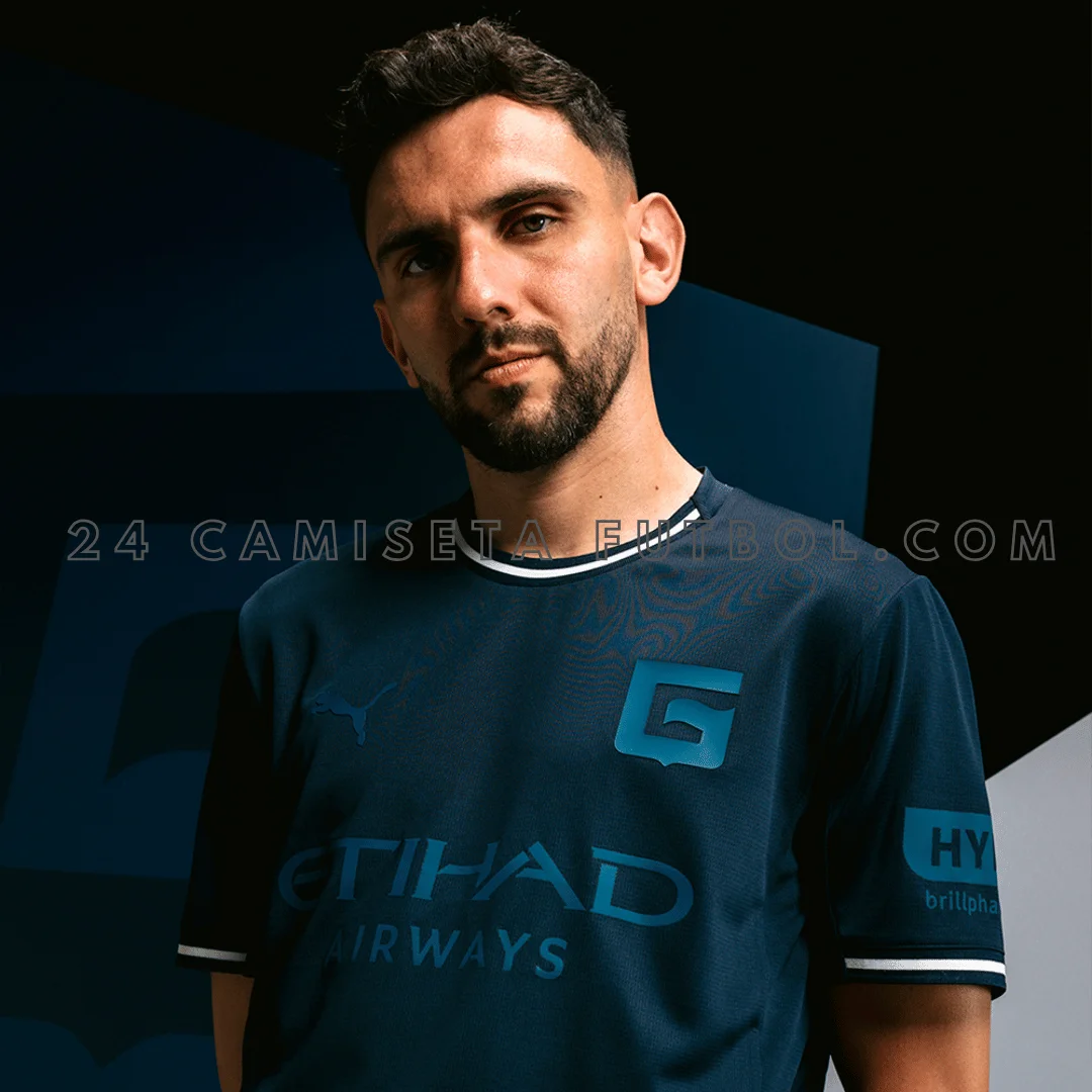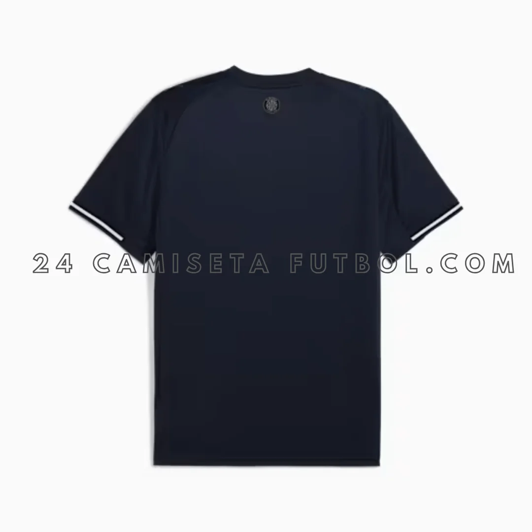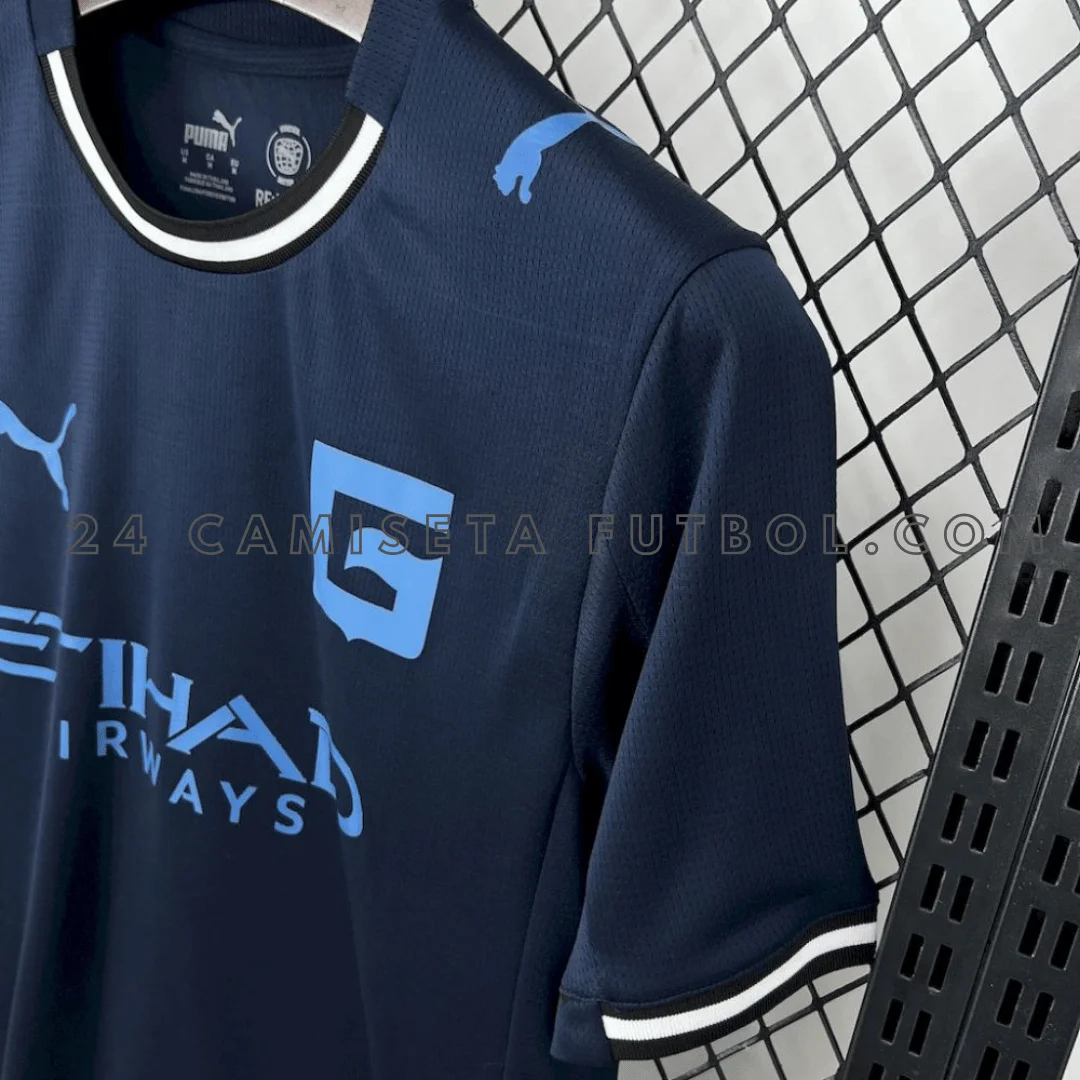 Es la tercera equipación girona de la temporada 2025/26. Fabricada por Puma, la empresa que diseña su ropa. El logo de Puma está en azul en un lado. Esta equipación está especialmente diseñada para los porteros del Girona CF dentro de las camisetas laliga 2025/26. El color principal de esta camiseta es un azul marino profundo. Tiene sutiles rayas en un azul similar por toda la camiseta, formando un patrón suave. En lugar del escudo habitual del equipo, hay una gran “G” estilizada en azul en el frente que representa a Girona. En el lado izquierdo está escrito en azul “ETIHAD AIRWAYS”, su principal patrocinador.