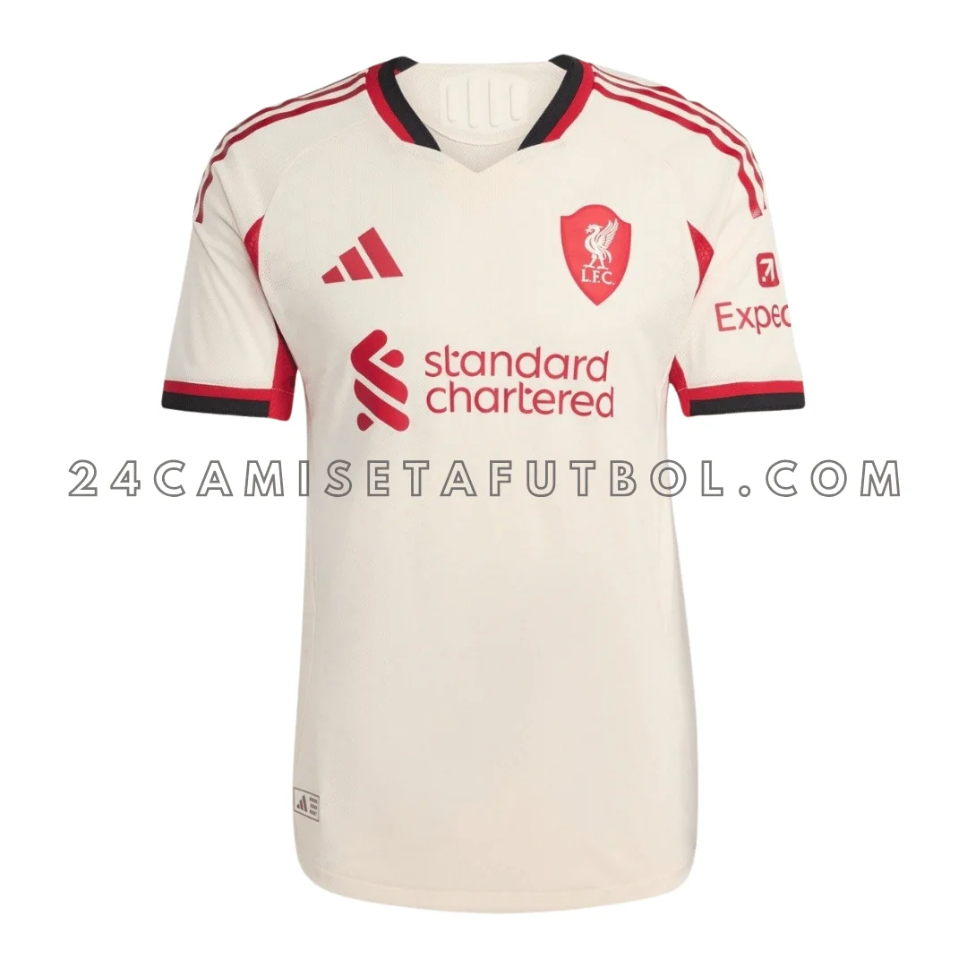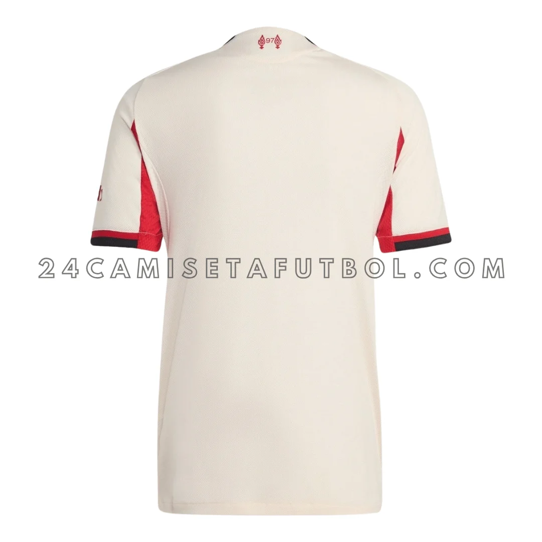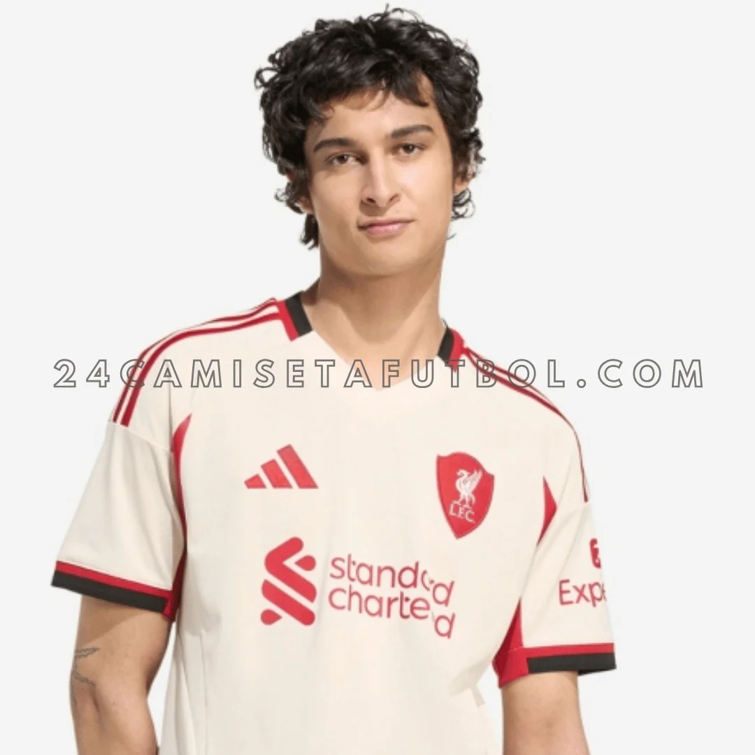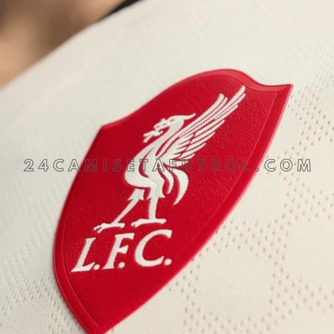 La paleta de colores de esta camiseta incluye blanco roto con acentos en negro y el rojo tradicional. La base de la camiseta es blanco roto liso, también llamado «maravilla blanca». Los logotipos de la marca y del patrocinador están colocados en rojo en el pecho. El escudo también está finamente colocado en rojo en el pecho. Los hombros presentan tres rayas rojas que llevan un elemento tradicional. El cuello de la camiseta Liverpool segunda equipacion es un cuello en V con contornos en rojo y negro. Las mangas también tienen un contorno similar. La camiseta también tiene paneles rojos bajo las axilas. La parte trasera del cuello también tiene un símbolo «97» con llamas eternas. Este emblema es un tributo a las víctimas del desastre de Hillsborough. Si deseas un look completo, combina esta camiseta con la liverpool camiseta primera 25/26.