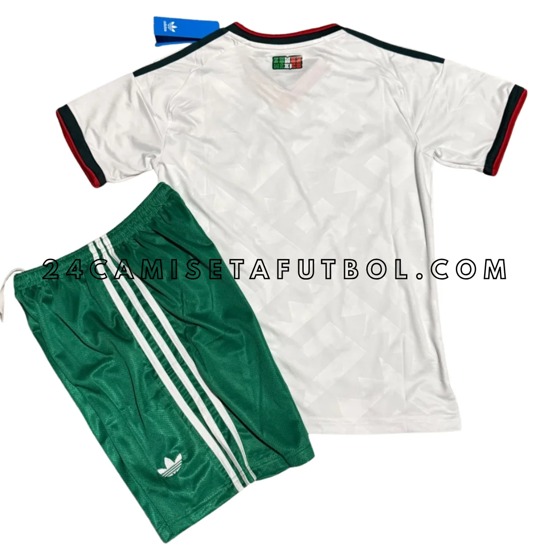 Esta es la camiseta México niño 2026 segunda, la versión blanca y limpia para niños, combinada con pantalones cortos verdes. Es de un blanco brillante y bonito, como la nieve fresca o una nube limpia.
