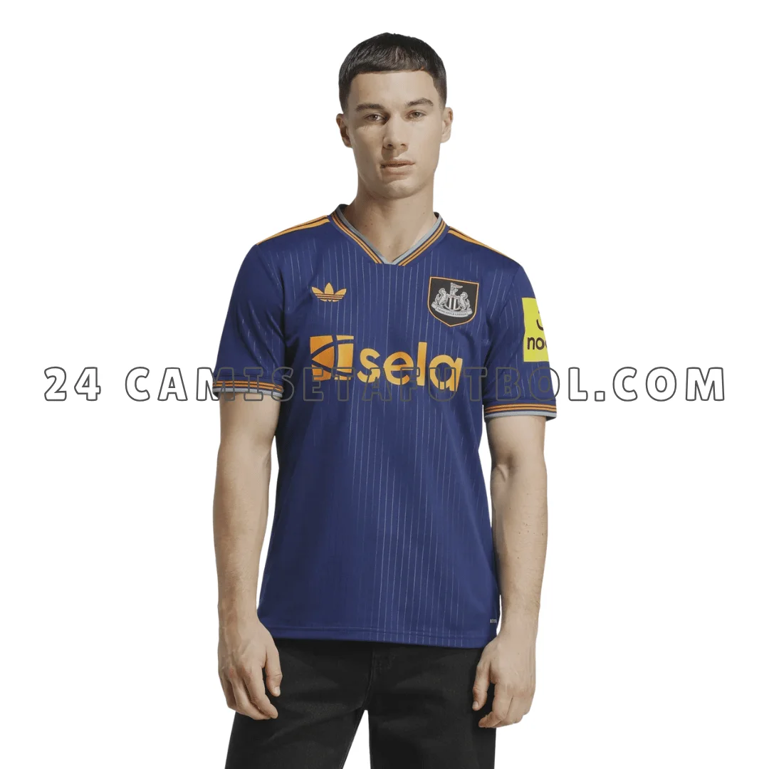 Los colores de la camiseta son azul, azul cielo y naranja. La base es azul liso con acentos en naranja y azul cielo. Los hombros llevan tres rayas tradicionales en naranja. Las mangas llevan un detalle de puños en naranja y azul cielo. El cuello en V de la camiseta de la equipación tercera Newcastle United también tiene un contorno de finas rayas azul cielo y naranja.