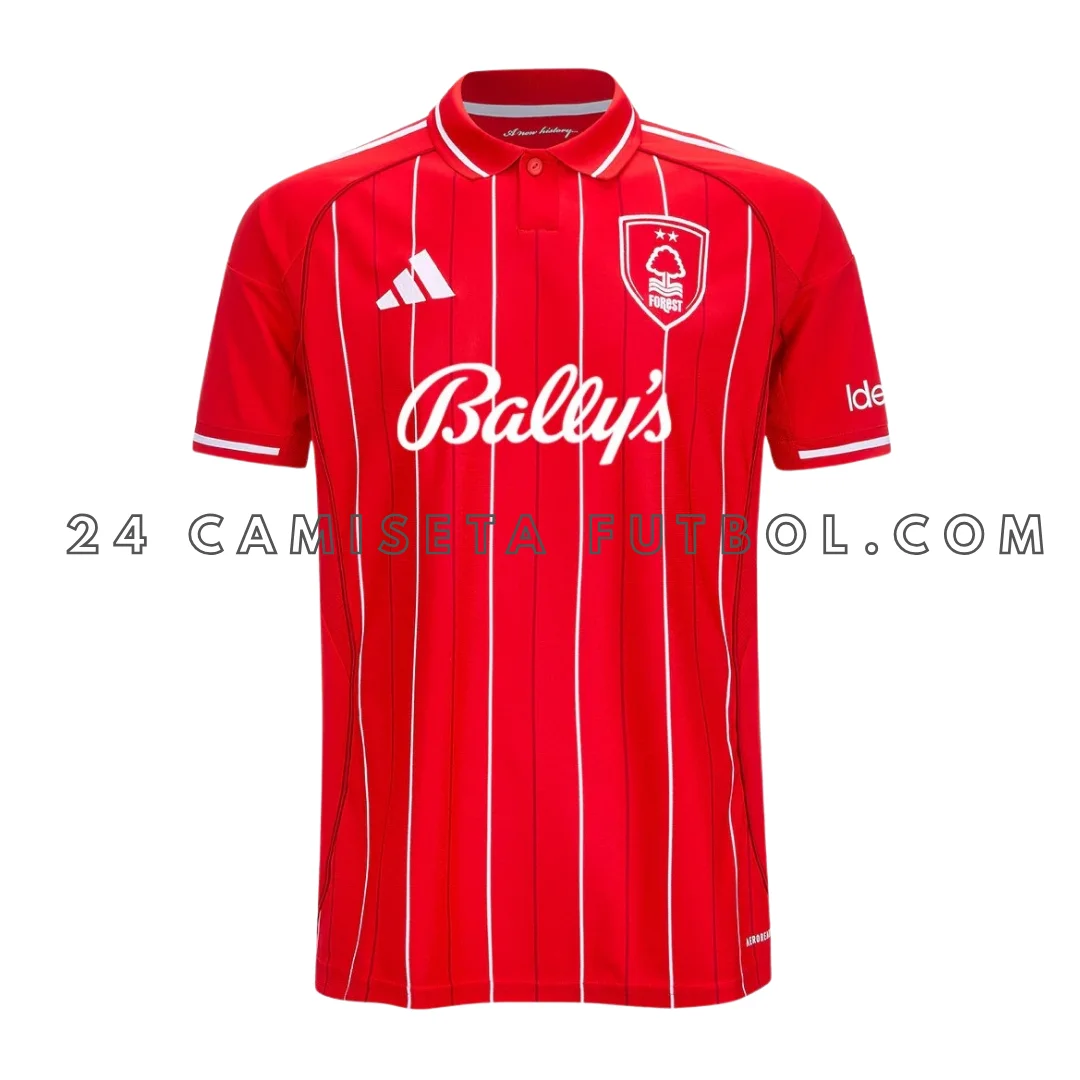 El elegante estilo polo de la Nottingham Forest Primera Equipación 2025/26 con un botón y bordes blancos en el cuello y los puños de las mangas, le da un look moderno y renovado. “Bally’s” en grandes letras blancas y curvas en el centro es el patrocinador principal de la nottingham forest primera camiseta.