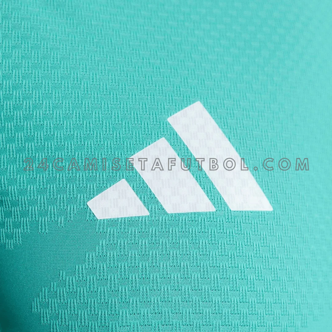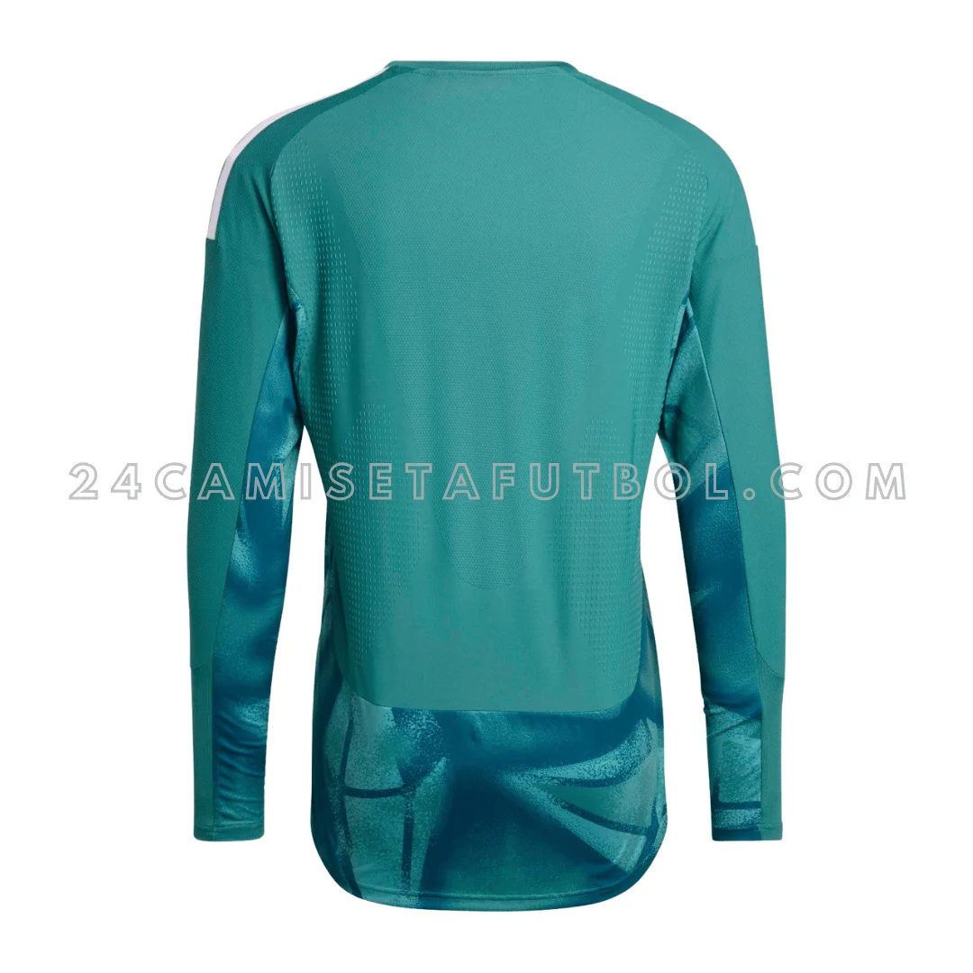 La combinación de colores de esta equipación de portero es moderna y tranquila. Los colores principales son diferentes tonos de verde, incluyendo turquesa y verde agua, combinados con detalles en azul marino y blanco.