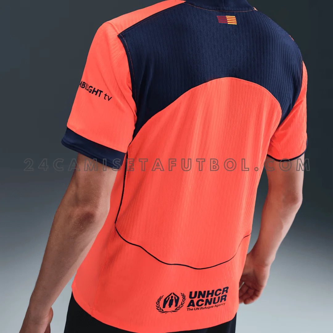 Esta camiseta naranja es la FC Barcelona Tercera equipación 2025/26, perfecta especialmente para la nueva tercera equipación del portero. El naranja brillante de la camiseta se llama «Bright Mango» por Nike y el club, con detalles en azul marino oscuro en el cuello, mangas y laterales. El naranja es un color especial para el Barcelona porque trae recuerdos de grandes victorias dentro de las camisetas de equipos de futbol.
