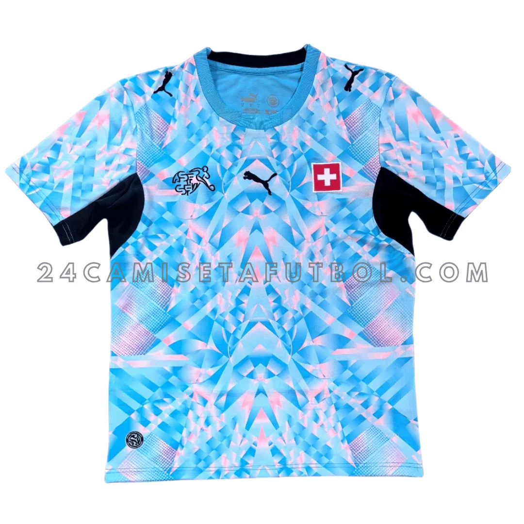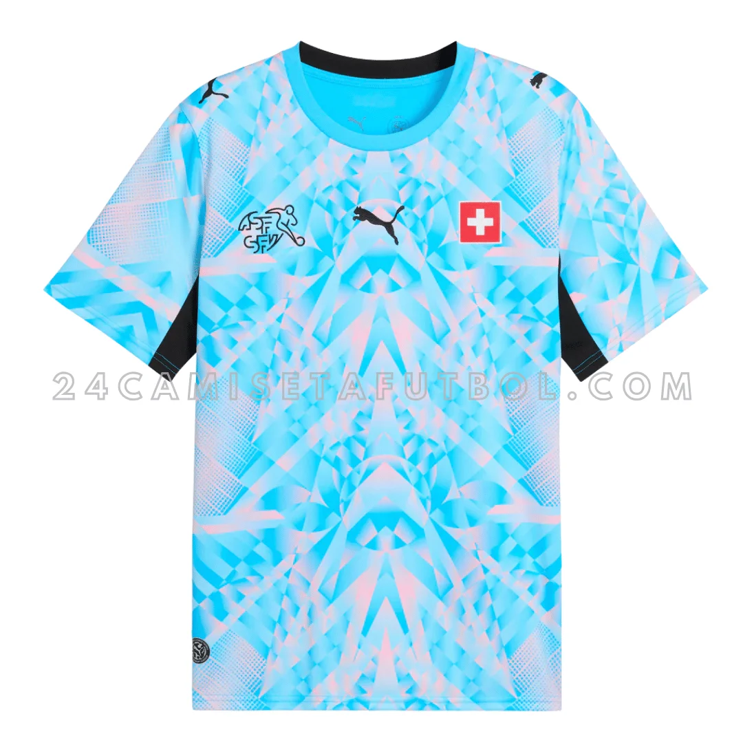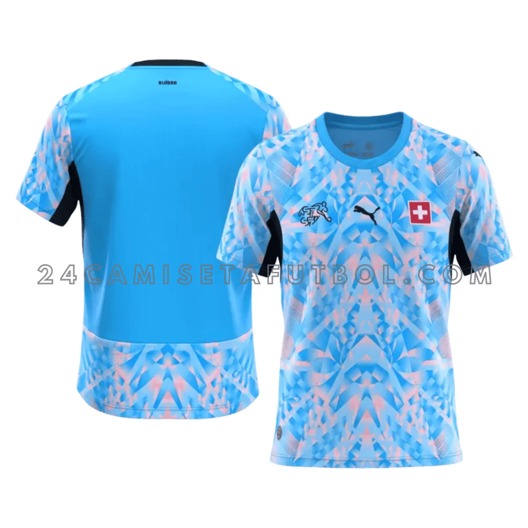 El kit Portero 1 de Suiza 2026 es un estilo muy fresco y moderno, que está hecho para el portero de la selección de Suiza para la próxima Copa Mundial de la FIFA. Tiene una paleta de colores muy única que trae frescura al campo. El color base es azul cielo con un hermoso patrón de formas geométricas y tipo diamante en rosa en toda la camiseta. Este patrón le da a la camiseta un aspecto muy enérgico.