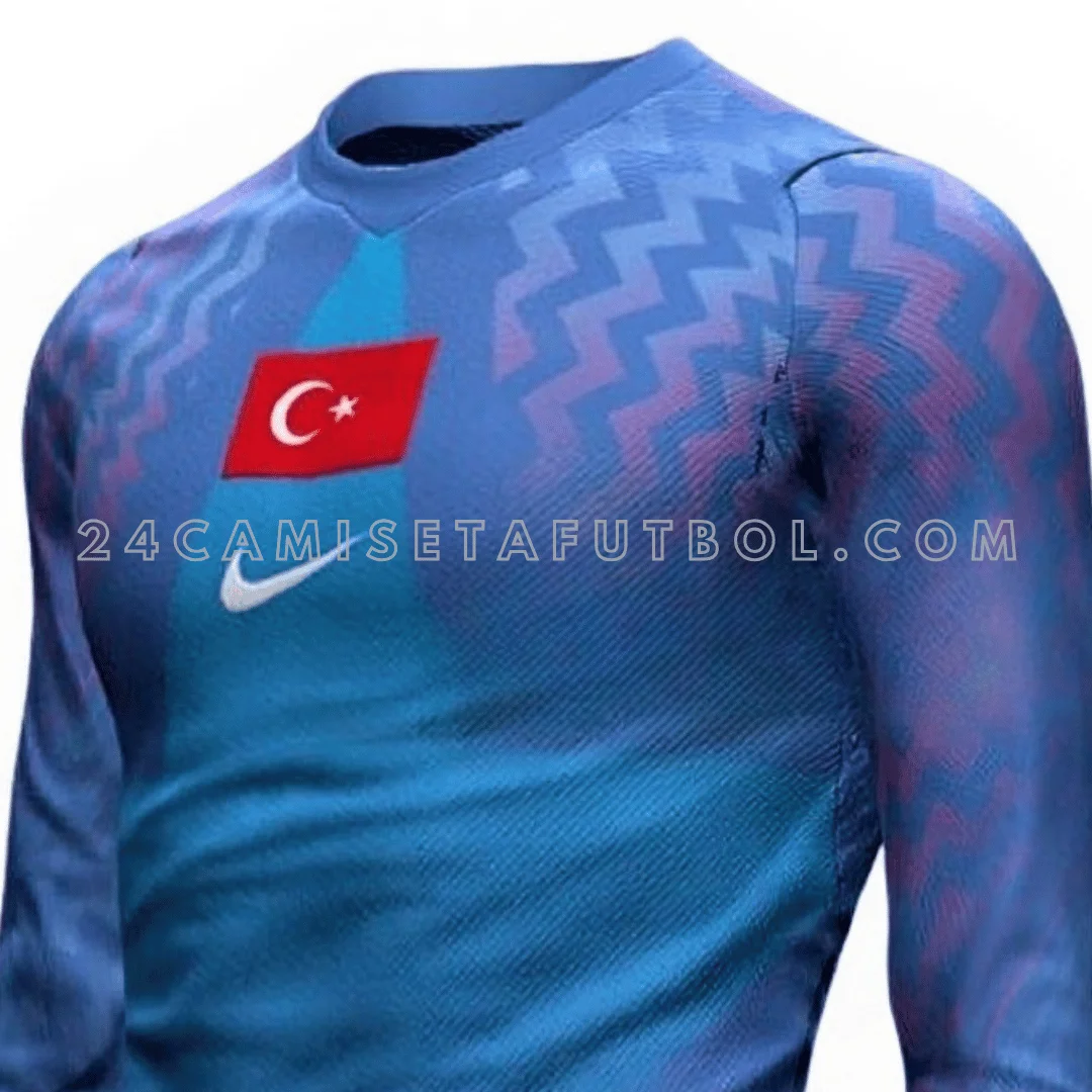 La primera equipación de portero de Turquía 2026 es una camiseta diseñada para porteros para la próxima Copa del Mundo 2026. La equipación de portero de Turquía 2026 tiene un diseño gráfico muy fresco y llamativo con detalles intrincados. La paleta de colores de la camiseta incluye dos tonos de azul y rosa. Hay una forma de estrella justo en el centro de la camiseta. La estrella es de color azul y su contorno grueso es de azul violáceo. Fuera de la estrella hay un patrón en zigzag en el mismo azul violáceo por toda la camiseta. Hay un tema rosáceo entre los patrones en zigzag. La bandera turca está cosida sobre la esquina superior de la estrella, con el logo de la marca debajo. Además, la camiseta tiene mangas largas y elegantes y un cuello redondo liso. En general, la camiseta portero selección de Turquía tiene costuras muy suaves y finas que le dan una apariencia premium.