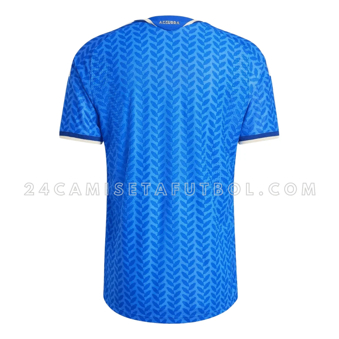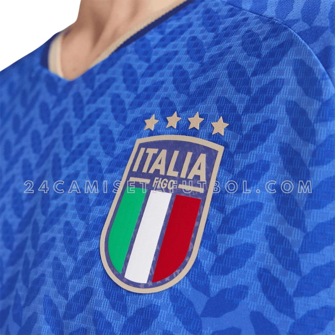 El kit de casa de Italia 2026 está diseñado para jugadores, aficionados y coleccionistas como una pieza esencial para el próximo Mundial. El color principal de la camiseta es azul, con pequeños patrones de hojas en azul marino a lo largo de la camisa. Las mangas cortas tienen una raya blanca en los hombros. Este diseño representa la historia de la victoria y gloria de Italia en partidos anteriores. El diseño gráfico con la paleta de colores vibrantes le da a la primera equipación Italia una apariencia muy moderna. Además, el logo de adidas está a la derecha del pecho con el escudo nacional a la izquierda. Tanto el logo de la marca como el escudo están bordados en dorado con los colores de la bandera.
