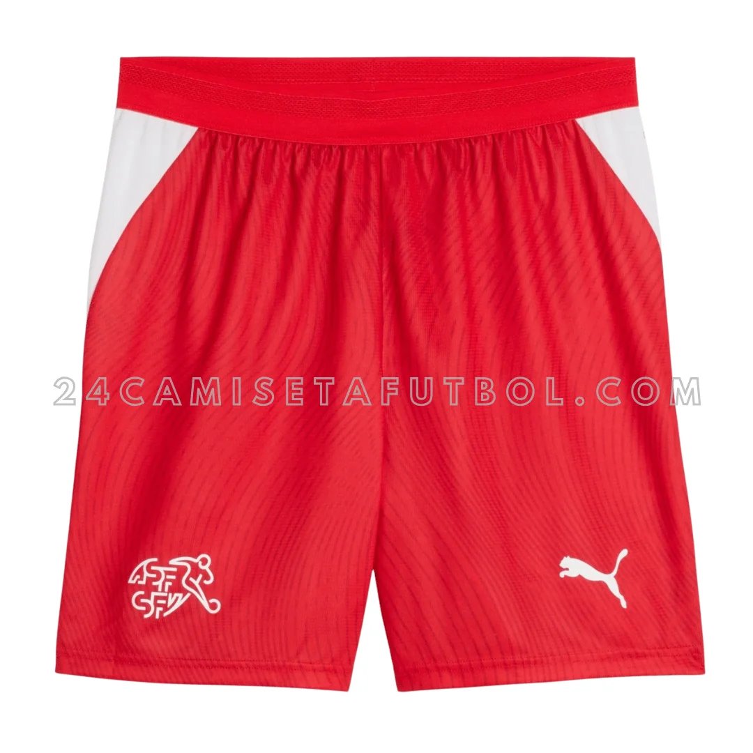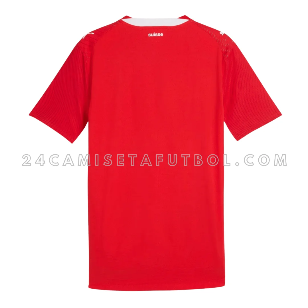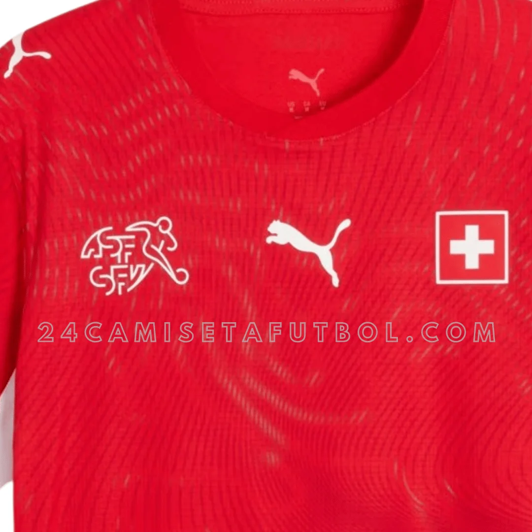 La camiseta de local de Suiza 2026 está diseñada en el tradicional rojo del país. Es una camiseta de local hecha para la Copa FIFA 2026. El color base de la primera equipación de Suiza 2026 es rojo con pequeños detalles en blanco. El diseño parece simple, pero tiene un gráfico de líneas curvas en toda la camiseta. Este patrón sutil está inspirado en el diseño del pasaporte suizo. El gráfico brilla bajo la luz ultravioleta, de forma similar a los elementos de seguridad del pasaporte, lo que añade singularidad a esta camiseta. La camiseta también tiene paneles laterales en blanco en ambos lados. La camiseta tiene un cuello redondo en rojo. Además, las mangas cortas de la camiseta primera equipación de Suiza 2026 también tienen detalles decentes en blanco. El emblema de la cruz nacional del equipo y el escudo de la SFV también están bordados en blanco en la parte delantera de la camiseta. El logo de la marca también está cosido en el medio y en ambos hombros en blanco. Todos estos detalles le dan a esta camiseta de local una apariencia muy decente y simple pero potente.