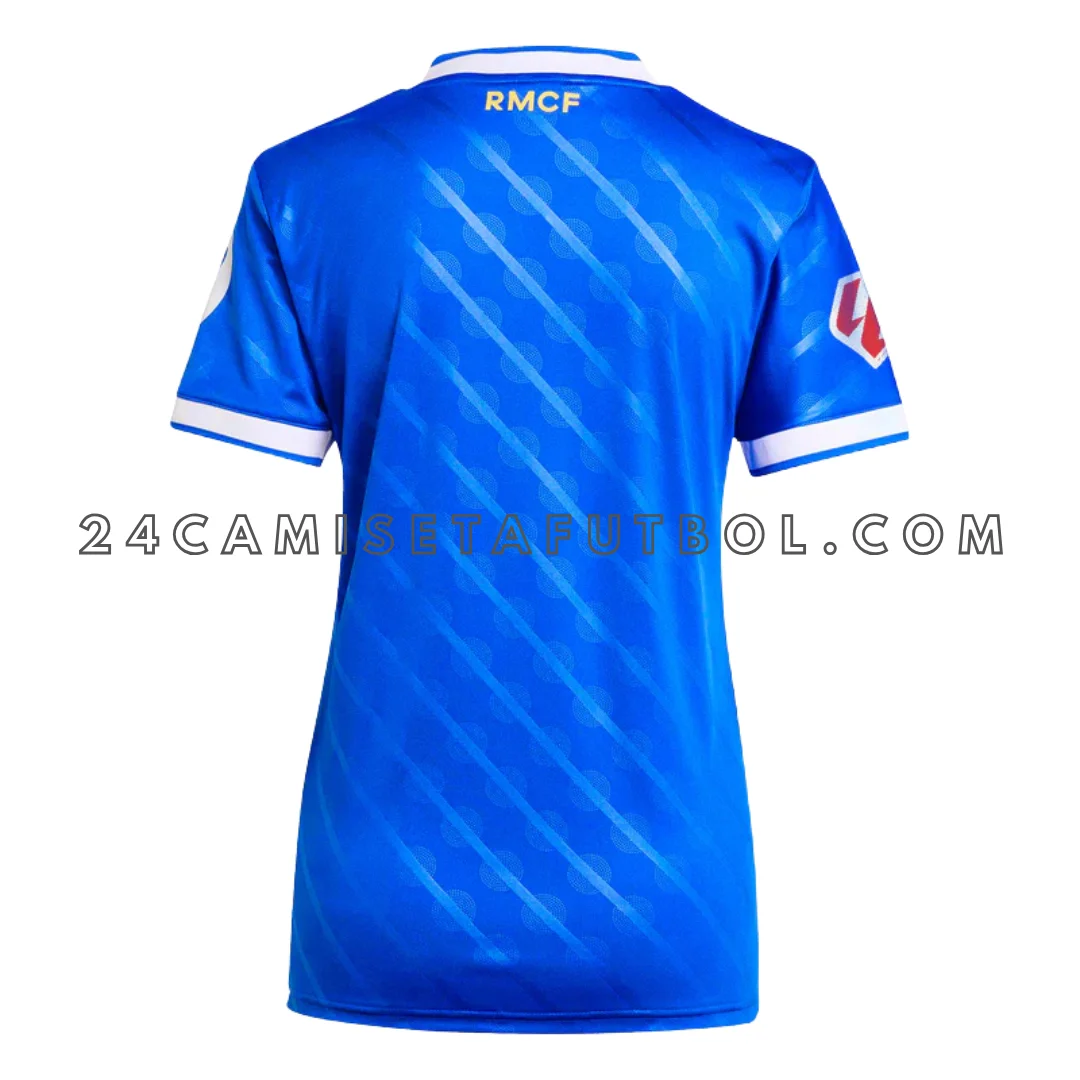 La base azul intenso y el cuello sencillo le dan a la equipación mujer Real Madrid tercera un look único. Esta camiseta Real Madrid mujer tercera fútbol es perfecta para que las mujeres la luzcan tanto en los partidos como de manera casual. Además, mantiene a las fans frescas y cómodas dondequiera que vayan.