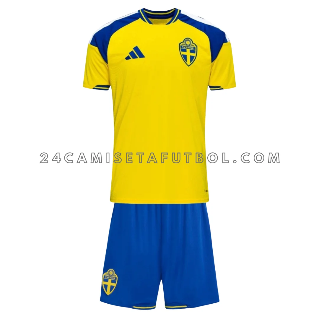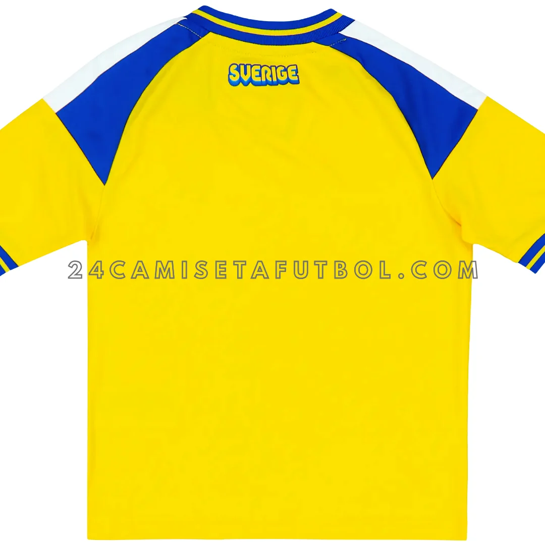 La camiseta oficial primera equipación Suecia niño tiene una base amarilla con acentos azules contrastantes en los hombros y el cuello. Los colores generales de esta camiseta coinciden con los de la bandera de Suecia. Los detalles en azul añaden un contraste dinámico que representa la rica tradición futbolística de Suecia. La camiseta primera equipación Suecia fútbol niño tiene el escudo oficial del equipo con “Sverige”, simbolizando de manera destacada la identidad del equipo.