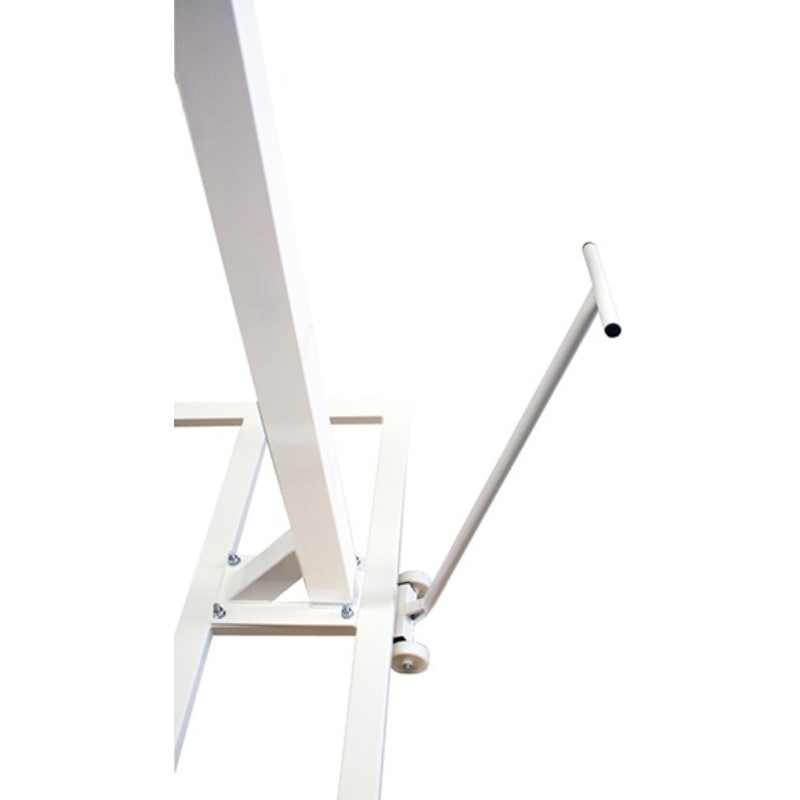 Contiene un sistema de tuercas de nivelación en el soporte de tablero e incorpora también dos tirantes superiores de estabilización a las esquinas del tablero y otros dos inferiores a los fondos de la base con ruedas.