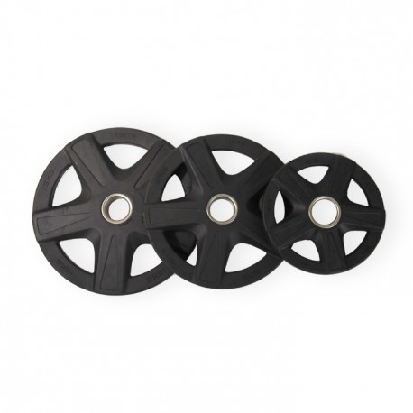 Disco Olímpico de 51 mm con acabado premium y casquillo de acero. Están fabricados en hierro con revestimiento de goma y acabado premium, casquillo central de acero de 51mm y agarres para facilitar su manejo.