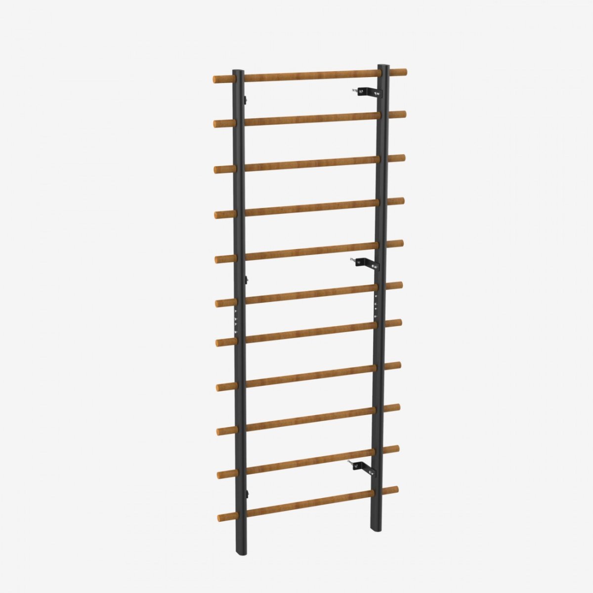Los postes laterales están fabricados en acero negro de sección 70×30 mm, proporcionando una base estructural firme y segura. Los travesaños están elaborados en haya maciza con un diámetro de 38 mm, cuidadosamente mecanizados y lijados para ofrecer un agarre cómodo, seguro y resistente al desgaste.
