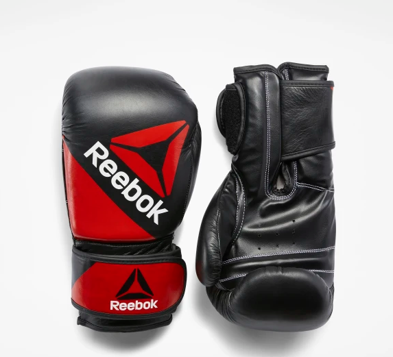 Con la marca Reebok prominente en blanco y negro, los guantes están disponibles en 10 oz y 14 oz.