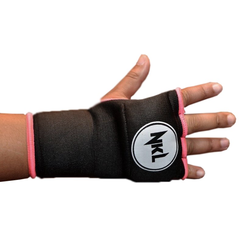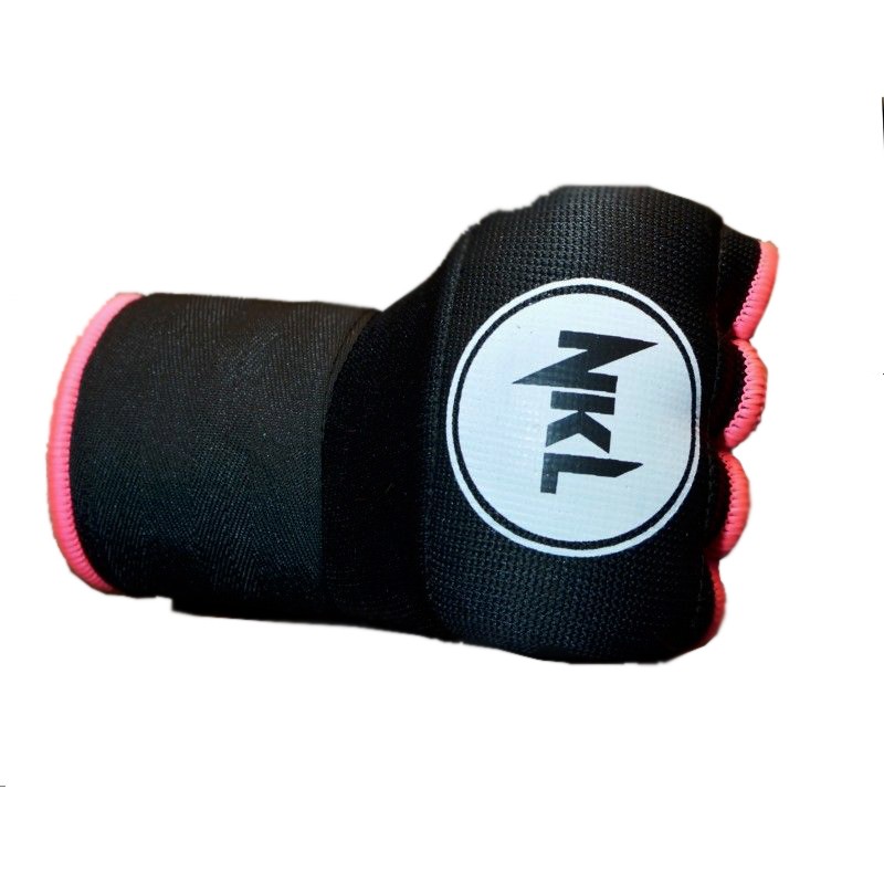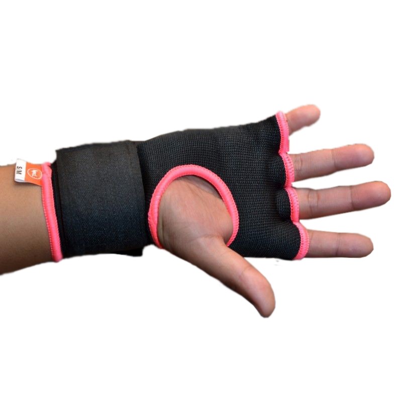Guantilla interior para la práctica de boxeo. Cierre regulado con velcro. Fabricada en color negro con ribetes en color rosa. Logo de la marca impreso.