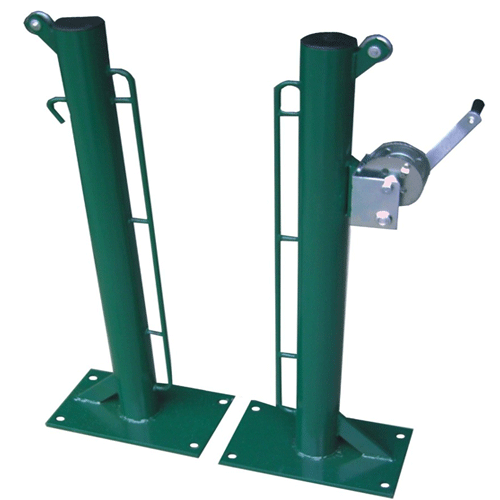 Postes fabricados en tubo de acero de sección redonda de 80 x 2 mm. diseñados para anclar al suelo mediante pletina metálica rectangular, la cual se atornillará a la propia pista de hormigón.