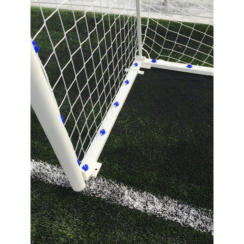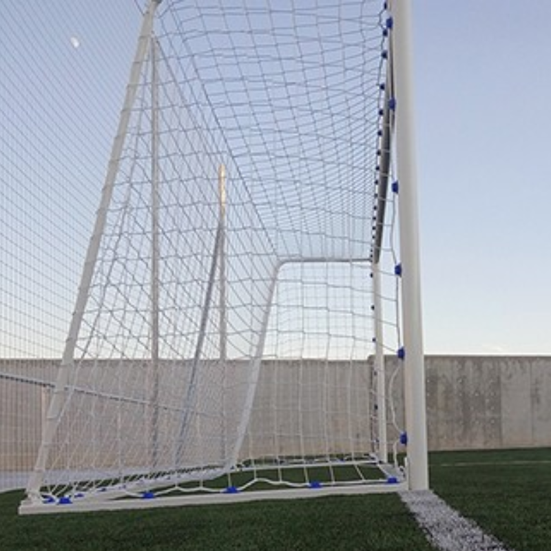 Todas las porterías trasladables SOFTEE EQUIPAMENT metálicas incluyen, marco de 80 mm y bases en acero de sección 80×40 mm, ganchos de poliamida para sujetar la red a la parte trasera del marco y a la base, arquillos metálicos traseros por donde desciende la red y por último también incluye cada portería 4 pletinas con agujeros de 1,5 mm por si tiene necesidad u ocasión de anclarlas al suelo.