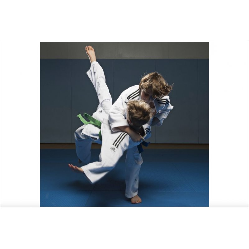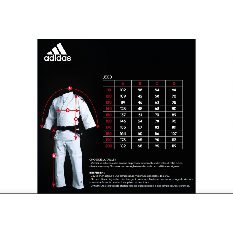 Judogi Adidas J500 blanco con bandas de color negro en los hombros. Nuevo