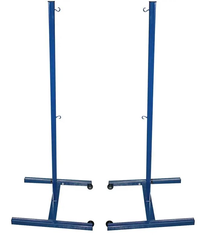 Postes desmontables fabricados en tubo metálico de sección 35×35 mm, provisto de 2 ruedas de nylon para su fácil traslado. Postes orientados a nivel escolar y de iniciación. No incluyen contrapesos.