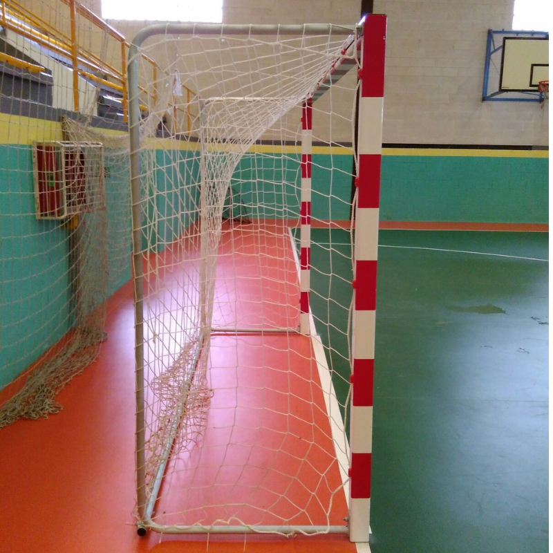 Cada portería debe estar sujeta al suelo, para ello en la base llevan, cada portería 2 pletinas con agujeros de 1,5 cm para poder atornillarlas al suelo.