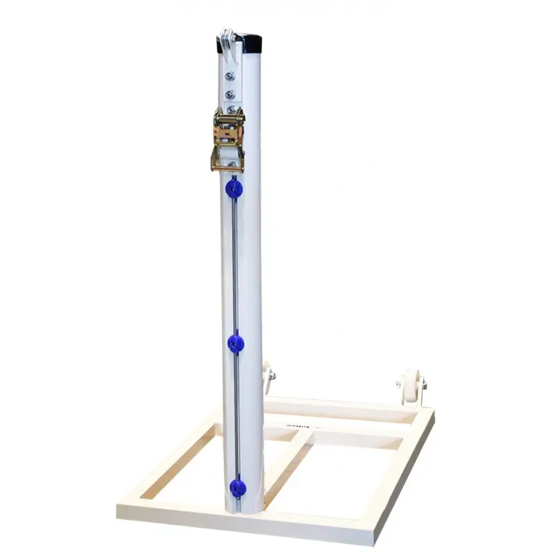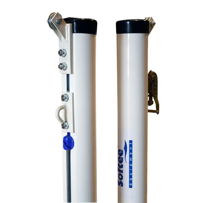 Juego de postes fabricados en aluminio nervado de sección redonda de 90mm. Diseñados para anclar a una base metálica trasladable provista de 2 ruedas de nylon fijas.