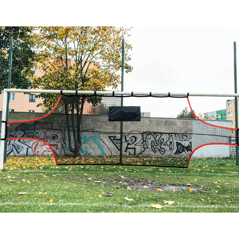 Red con sistema de agarre por medio de gomas a los postes y al larguero. Incluye picas para colocación en la parte inferior (opcional), para césped natural.