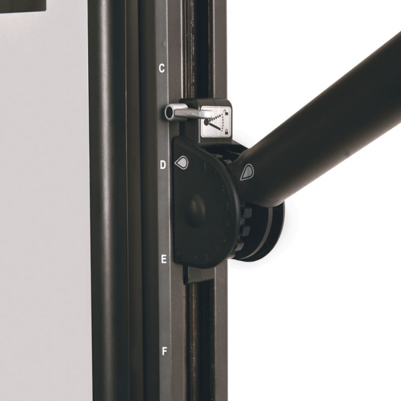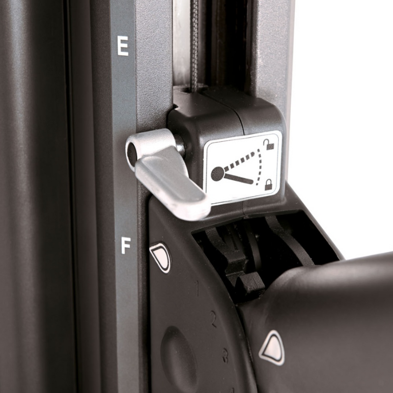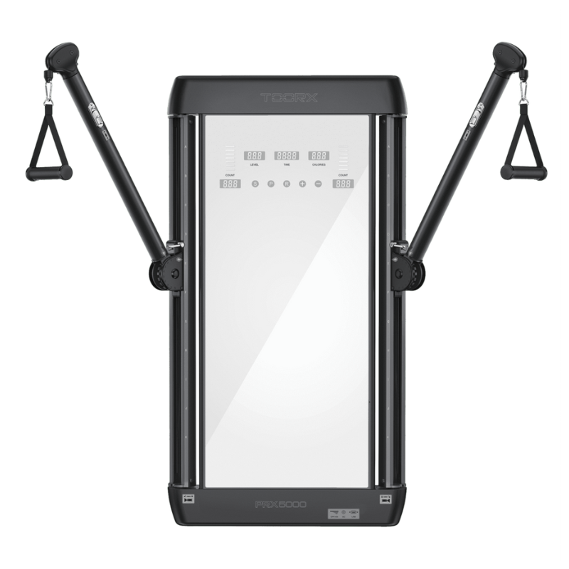 – CONSOLA, superficie de espejo con 5 ventanas LED. Funciones: tiempo, calorías, 8 programas preestablecidos, modo, selección de peso, contador de tracción de cada brazo oscilante, escala de intensidad de movimiento