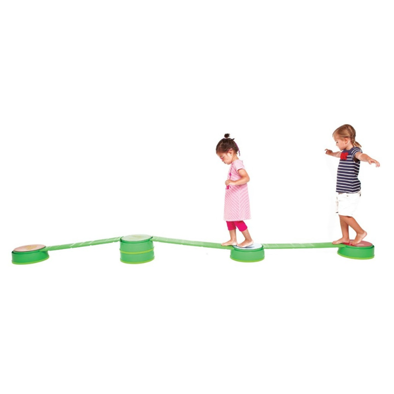 Juego de equilibrio y aprendizaje que ofrece múltiples combinaciones y actividades diferentes. Las bases se pueden apilar, creando desniveles acordes a la habilidad de los pequeños. Incluye discos intercambiables de diferentes colores y números.