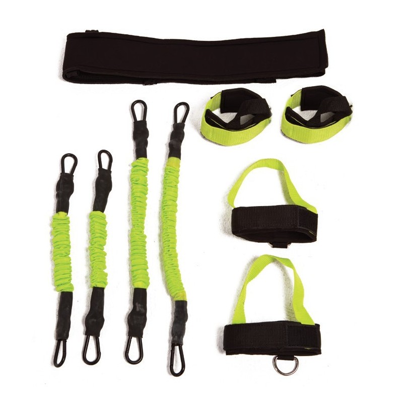 2 pulseras de muñeca y 2 pulseras de tobillo, unidas a 4 cables que se cuelgan de la correa resistente proporcionada.